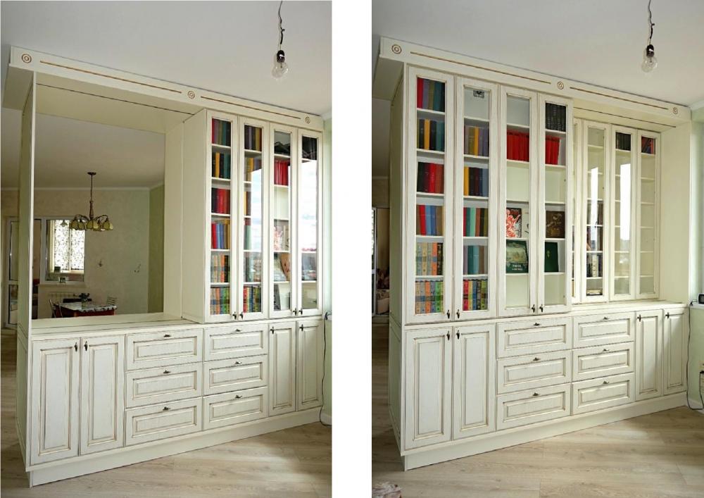 Раздвижная библиотека- это самая удобная конструкция для хранения книг. Книги хранятся в один ряд в каждой секции. Это облегчает поиск нужной книги и доступ к ней. То есть при общей глубине обычной библиотеки в 60 см., Вы ставите книги в два ряда. При этом, чтобы достать книгу из заднего ряда, вам приходится вытаскивать несколько из переднего. Еще и важно помнить, где какая книга находится. В раздвижной библиотеке для каждого ряда книг есть своя секция.