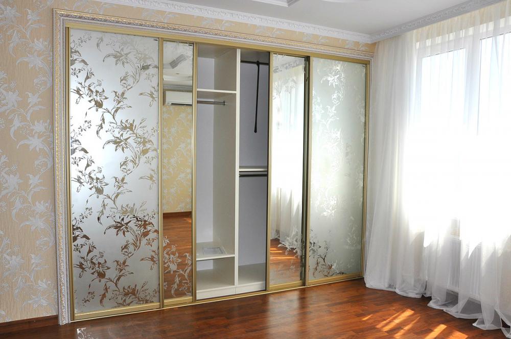 Фасады-купе: Алюминиевый профиль ЗОЛТО, зеркало СЕРЕБРО с пескоструйным рисунком. Багет белый с золотым узором.