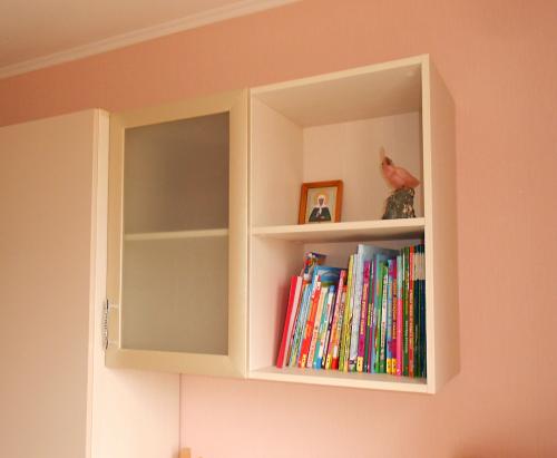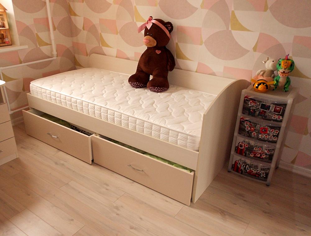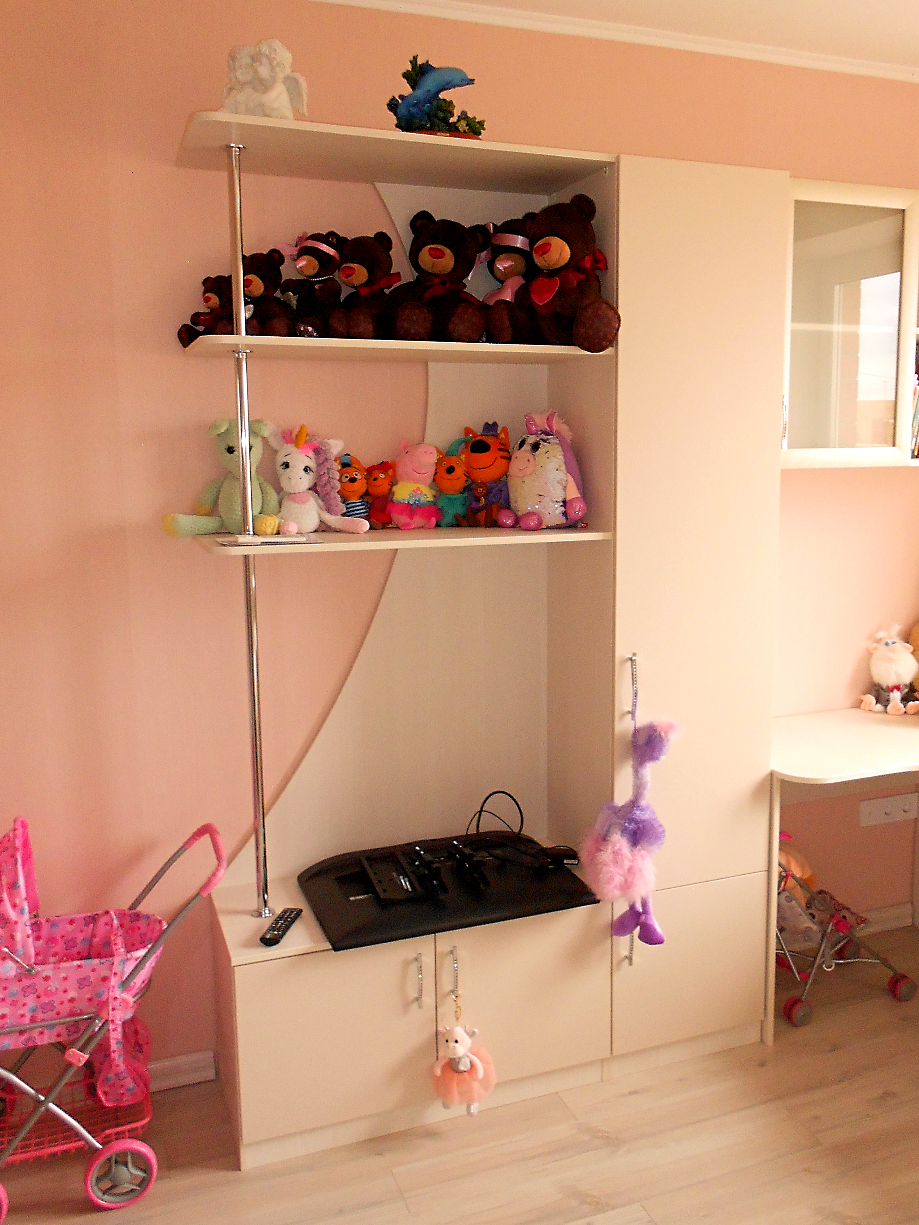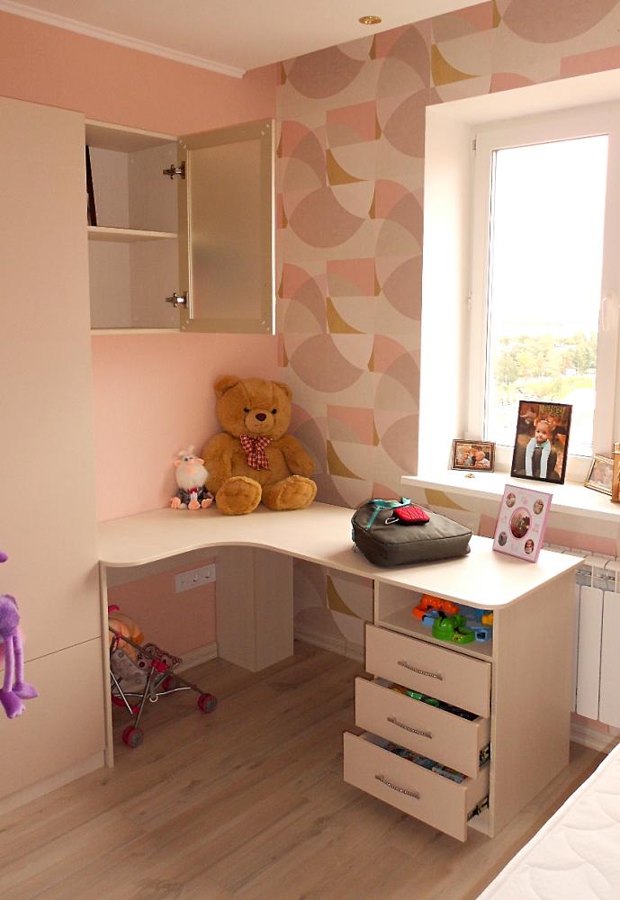 Набор мебели в спокойных пастельных тонах в комнату девочки. Набор состоит из кровати с двумя выкатными коробами, угловой рабочий стол с тумбой и подвесной полкой, интересной ТВ- зоны и вместительного шкафа- купе.