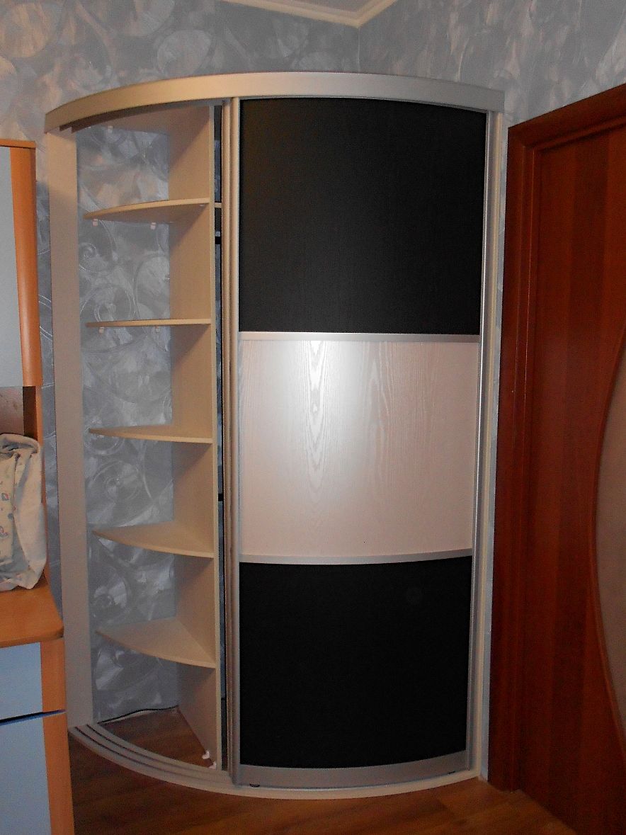 Набор необходимой мебели в детскую комнату с радиусным шкафом-купе для одежды и белья, двумя рабочими столами, подвесными полками и пеналом с цельным распашным фасадом.