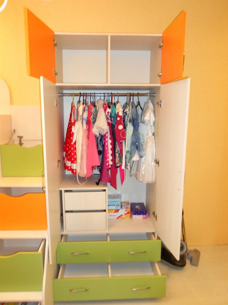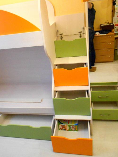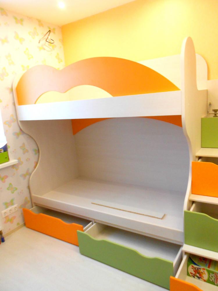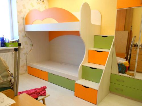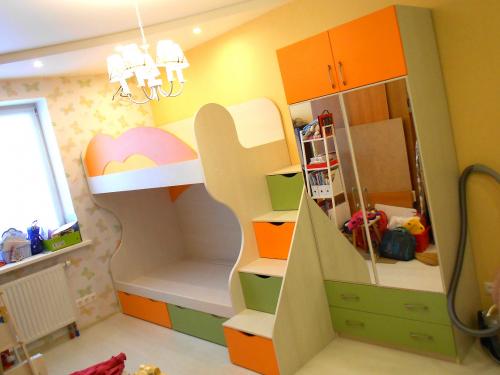 Яркий набор мебели в детскую. Двухъярусная кровать с выкатными коробами. Лестница из лдсп в выкатным нижним коробом, двумя выдвижными ящиками и верхним коробом с откидной крышкой. Шкаф распашной с антресолями, выдвижными ящиками и зеркалами. Этот набор мебели украсит Вашу детскую комнату и позволит разложить по полочкам детские вещи и игрушки.
