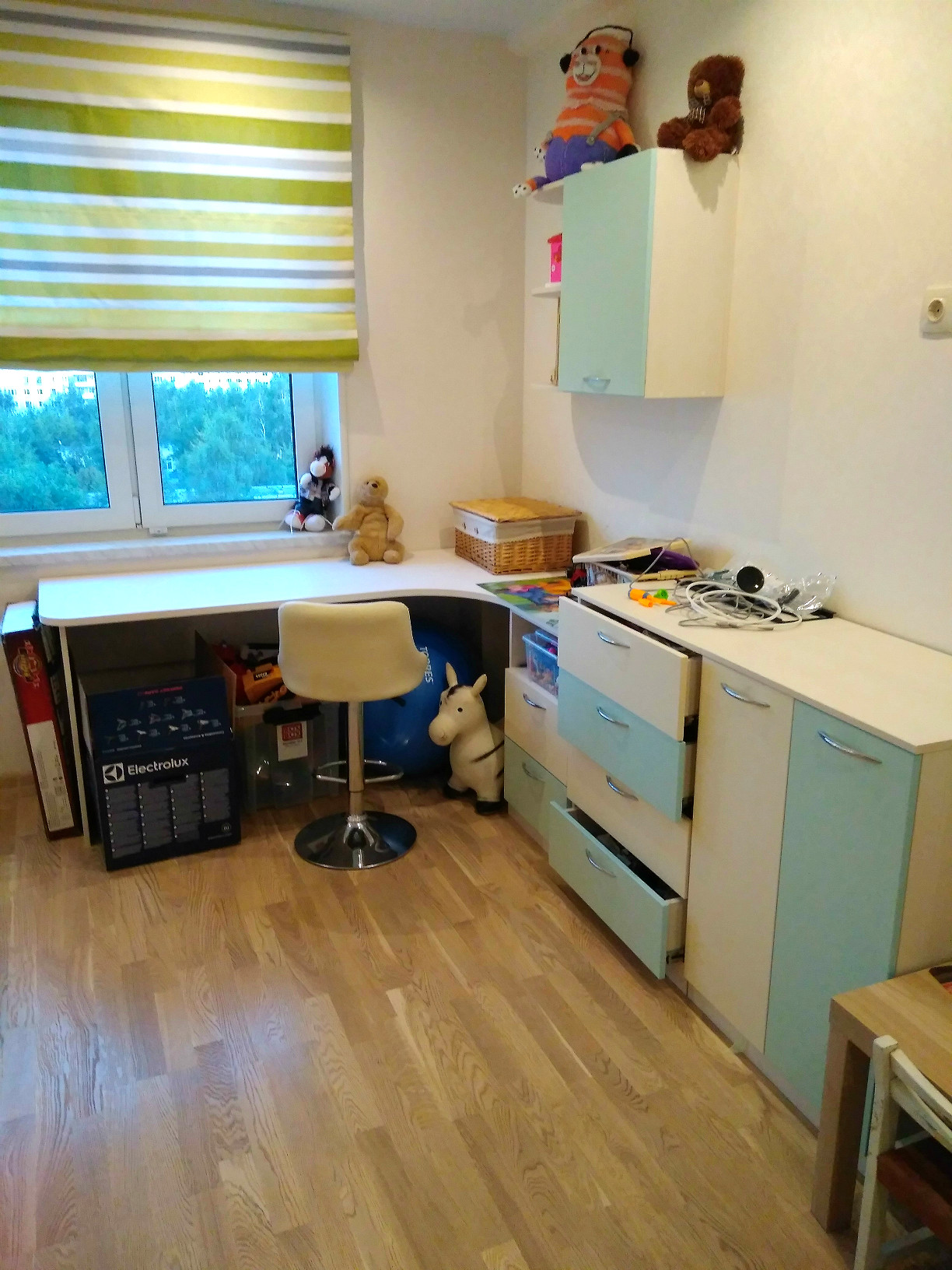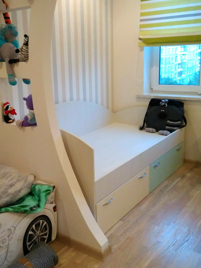 Все необходимое для отдыха и учебы в детской с мягкой комбинацией цветов фасадов и корпусов. Детская кровать с двумя выдвижными ящиками, большой угловой стол с тумбой и подвесной полкой, два комода и встроенный шкаф- купе.