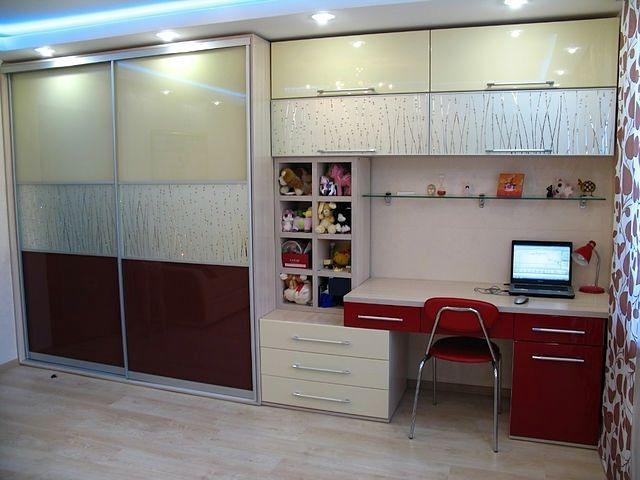 Красивый и солидный набор мебели в комнату для девушки, совмещающий в себе вместительный шкаф-купе для платья и белья, рабочий стол со множеством выдвижных ящиков, подвесные вместительные полки и открытые стеллажик и стеклянную полку для игрушек. Фасады-купе: Алюминиевый профиль СЕРЕБРО с делителями, глянцевая пленка ПВХ на МДФ основе, зеркало СЕРЕБРО с пескоструйным рисунком.