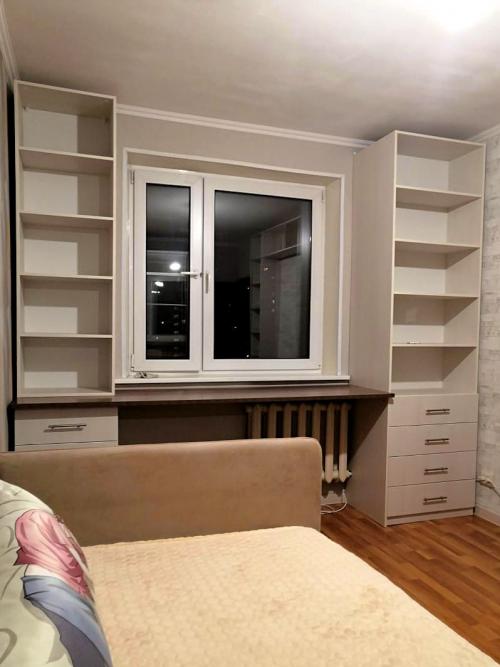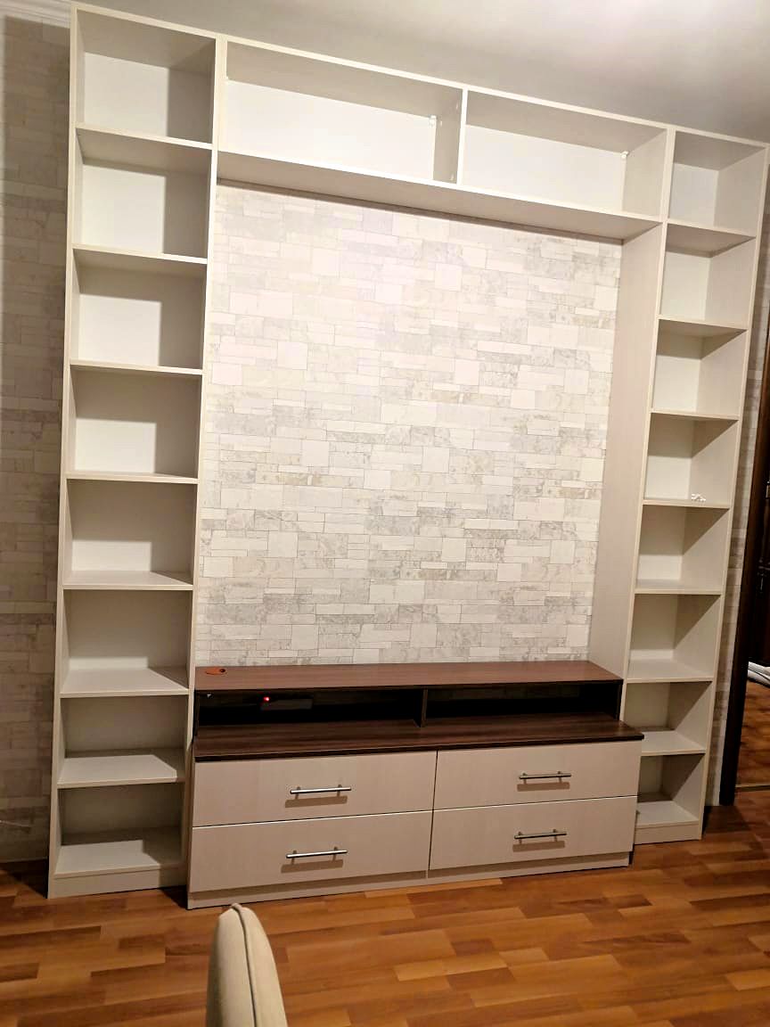 шкафом с выдвижными ящиками в нижней части и открытыми полками.
