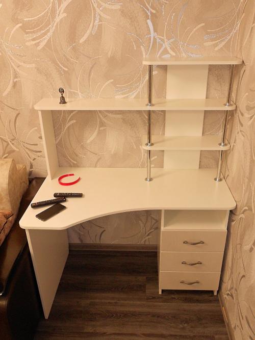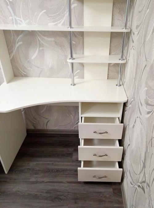 Не большой компьютерный стол в гостиную с выдвижными ящиками и открытыми полками.