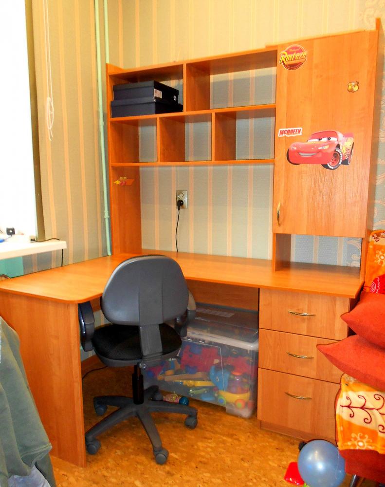 Удобный и эргономичный угловой компьютерный стол с открытыми полками и шкафчиком и тумбой с выдвижными ящиками. Фасады распашные и выдвижных ящиков: ЛДСП российское. Корпуса: ЛДСП российское. Адрес: г. Электросталь, ул. Пушкина.