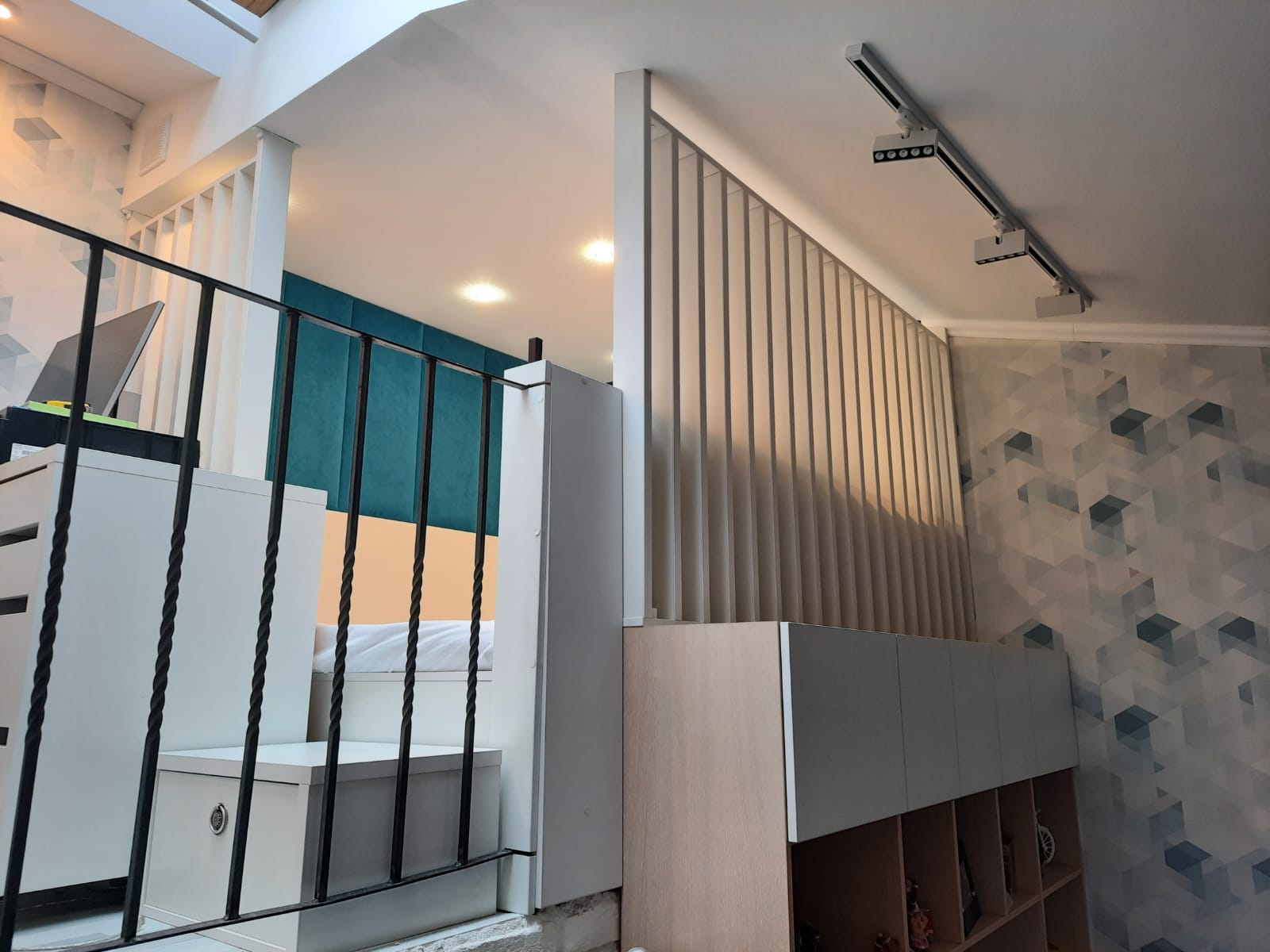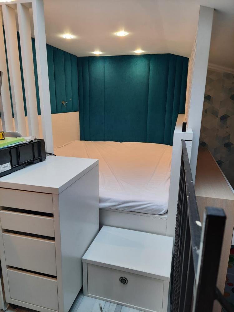 Оригинальная отделка спального места в мансарде. Постамент под спальное место 2.000* 1.800. Удобная ступенька с выдвижным ящиком. Вертикальными рейками спальное отсечено от общего пространства, что делает его более уютным.