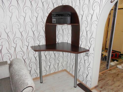 Оригинальный компактный компьютерный стол. Стол угловой, прикрепленный к стенам. Сверху полочка для принтера.