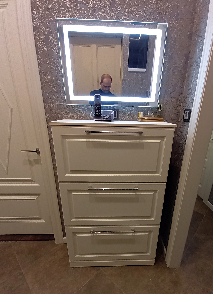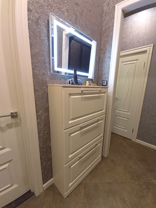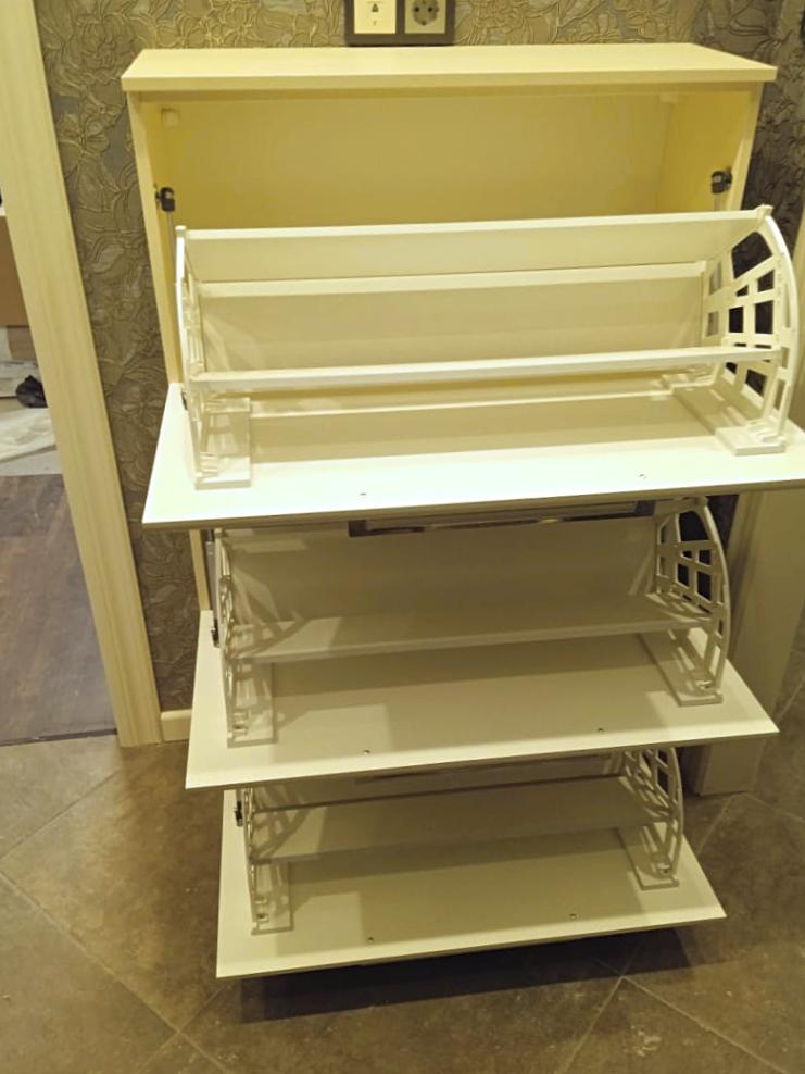 Симпатичная тумба для обуви с тремя ярусами для хранения обуви. Арматура пластиковая с вставками из лдсп, усиленная петлями и газовыми лифтами, что на порядок увеличивает срок службы. Обувница выполнена в классическом стиле. Фасады в пленке пвх с фрезеровкой.