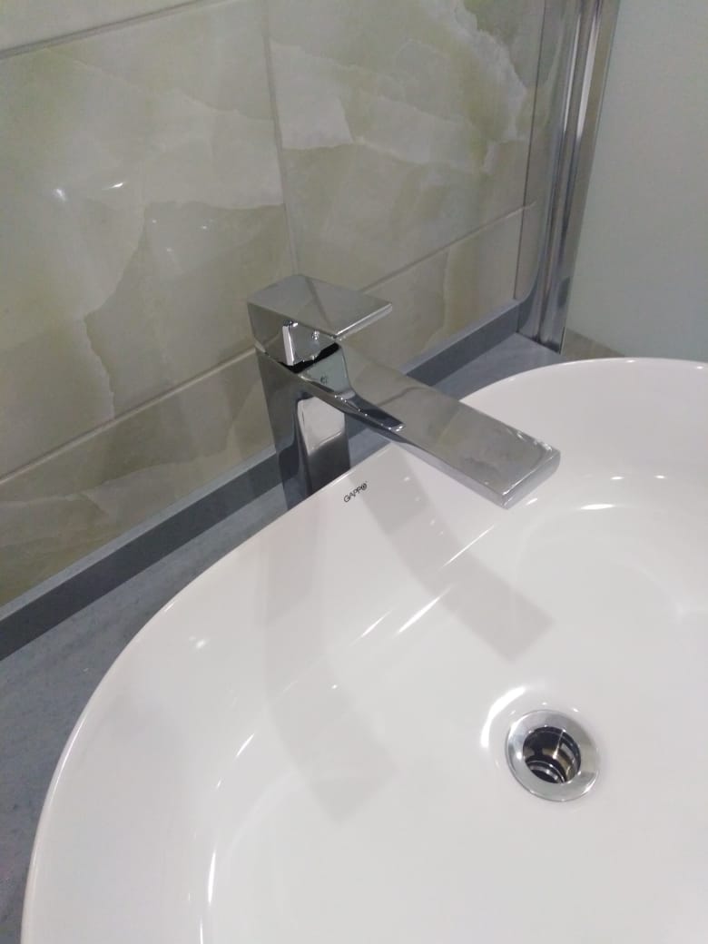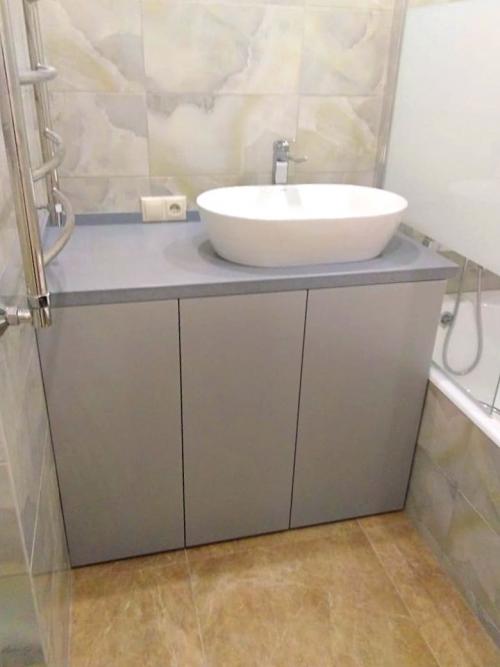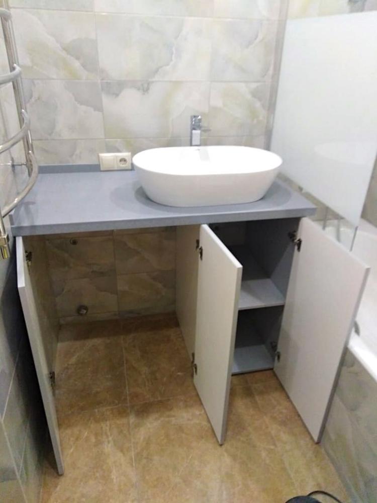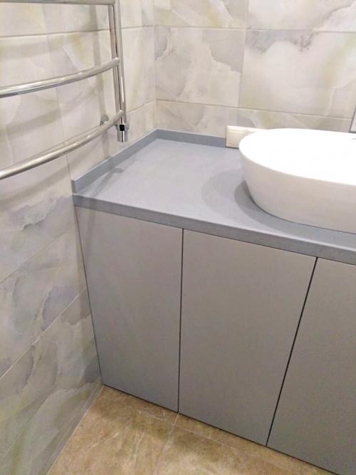 Встроенная тумба для умывальника в ванную комнату. Столешница из искусственного камня. Фасады- эмаль матовая.