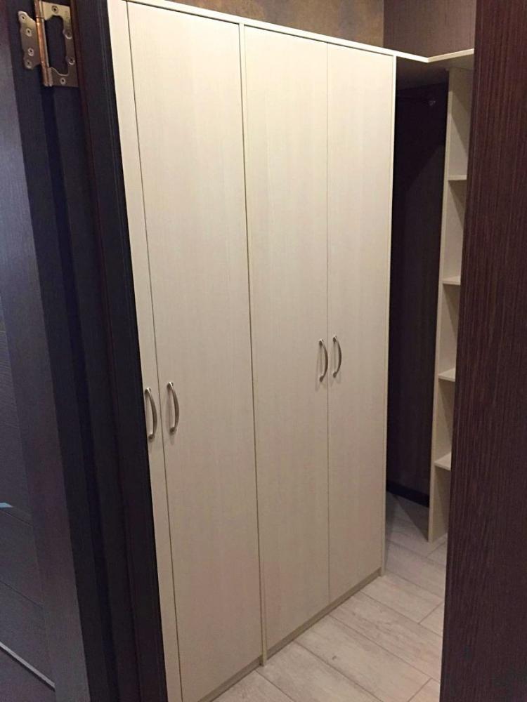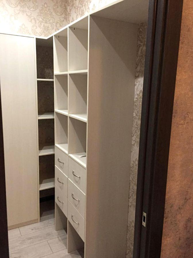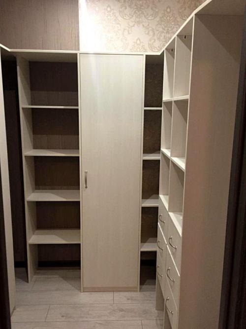 Удобная п- образная гардеробная с распашными фасадами, выдвижными ящиками, полками, штангами и большой антресолью. Отличный вариант компоновки, который позволит максимально использовать пространство и разгрузить другие комнаты.