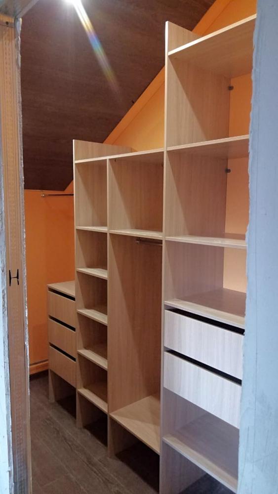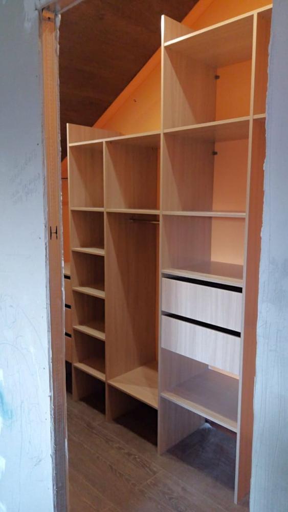 Встроенная гардеробная в отдельную комнату с наклонным потолком. Удобная система хранения с полками ,выдвижными ящиками