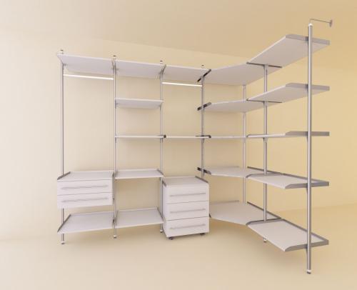 Угловой вариант стеллажей в гардеробную. Открытая система стеллажей, где глухие боковины заменены на алюминиевые стойки. Каждую полочку можно окромить специальным бортиком из алюминия. Тумбы могут быть как подвесными между стоек, так и выкатными и стационарными, стоящими не зависимо от стоек по бокам.
