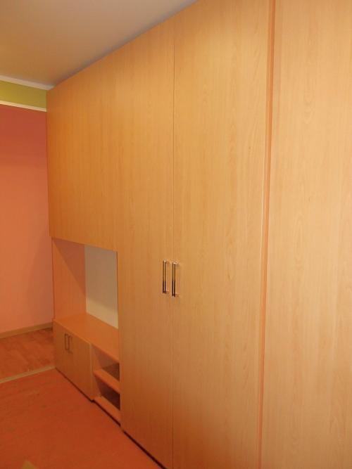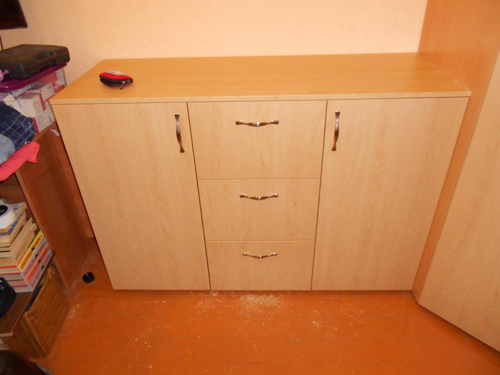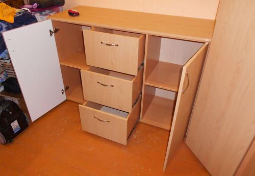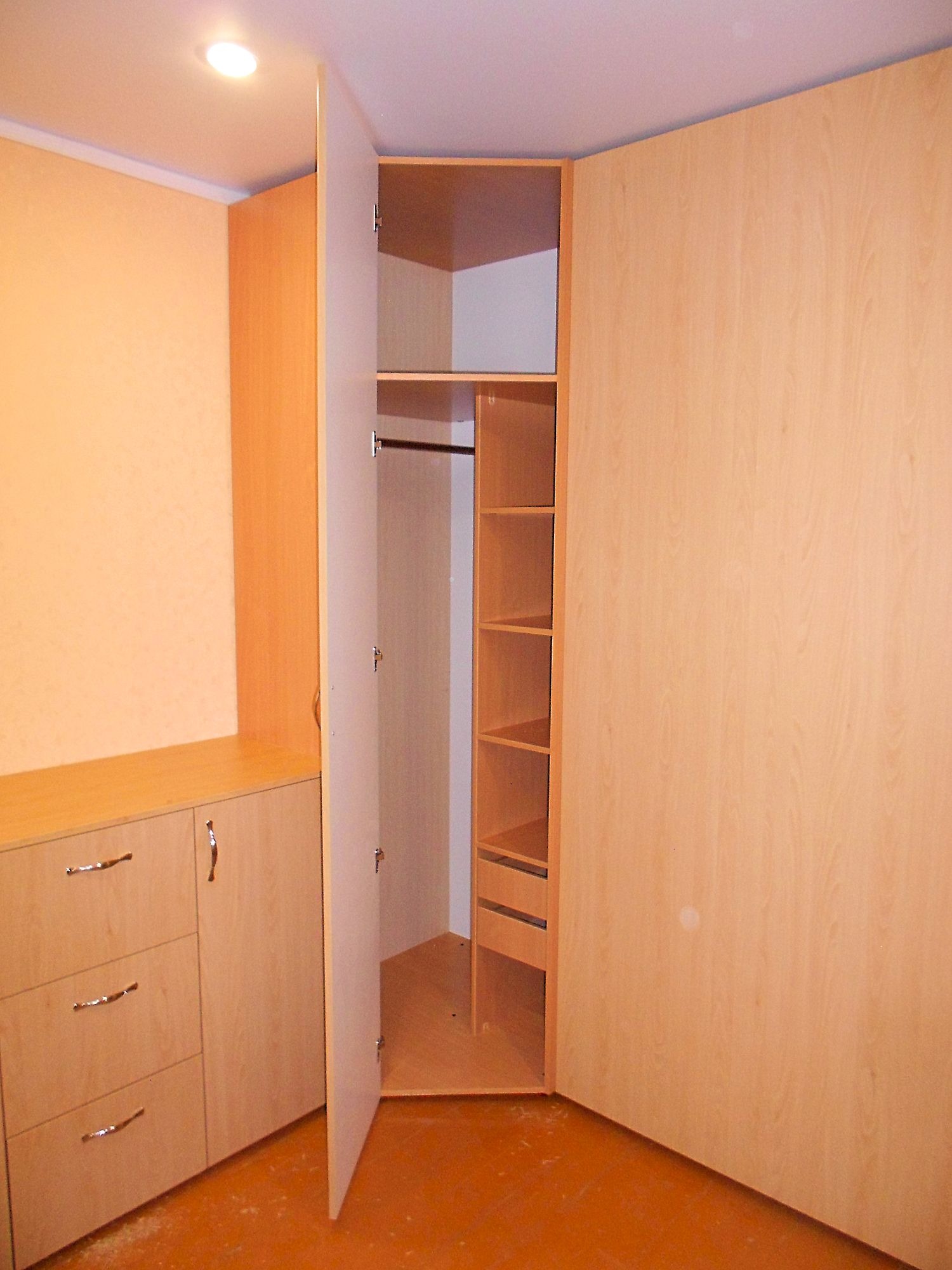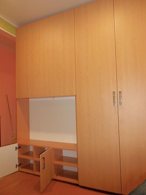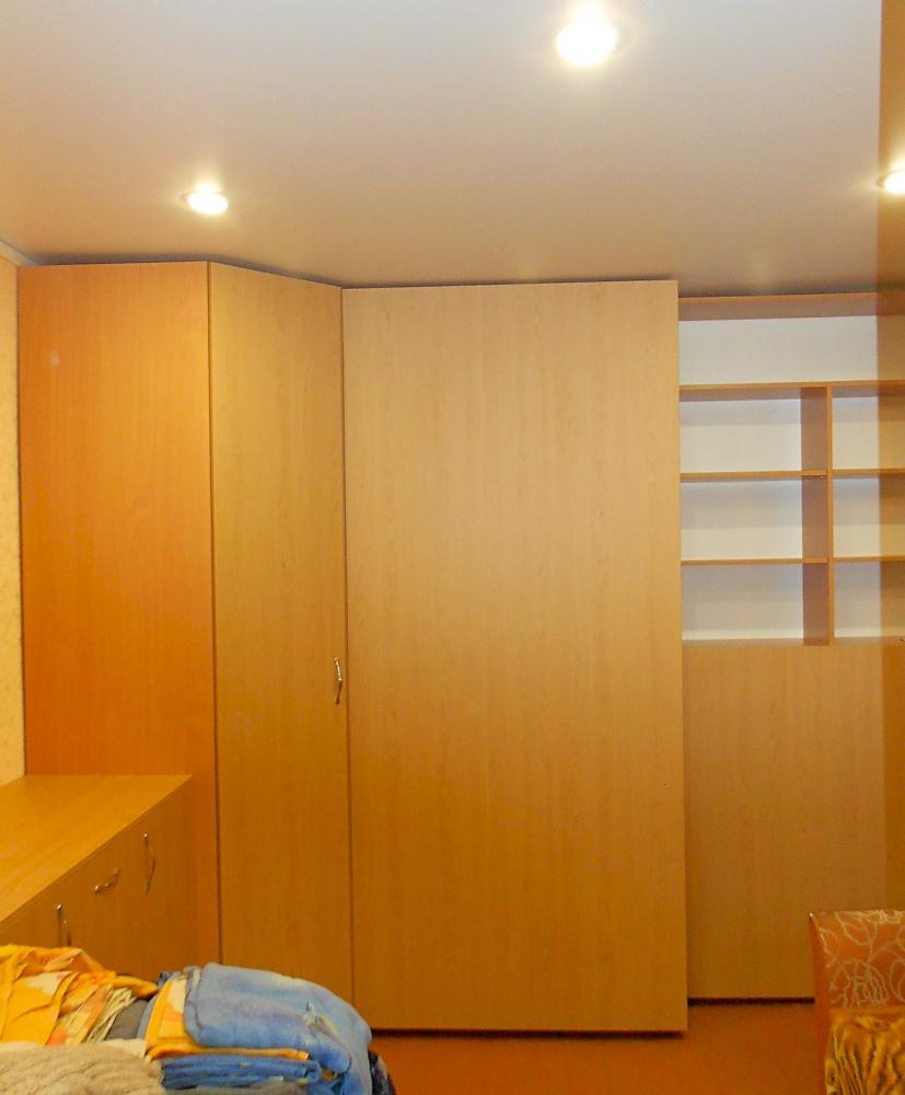 Двух сторонняя стенка с комодом, угловым шкафом, прямым шкафом и секцией с тв- зоной для гостиной комнаты. Стенка разделяет гостиную на две зоны. Каждый шкаф развернут в сторону своего хозяина. Обе стороны стенки являются лицевыми.