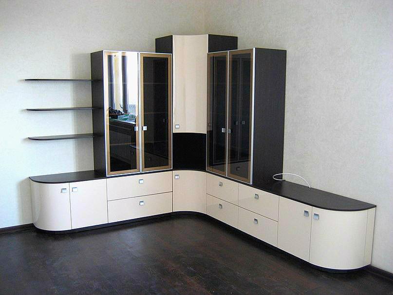 Удобная угловая "горка" со стеклянными и радиусными распашными фасадами, TV- зоной и открытыми полками в гостиную комнату. Не смотря на небольшие размеры, достаточно вместительная, чтобы навести порядок и разложить по своим местам все необходимое. В центре угловой шкаф с радиусными фасадами и открытой нишей. По бокам два шкафа- витрины.
