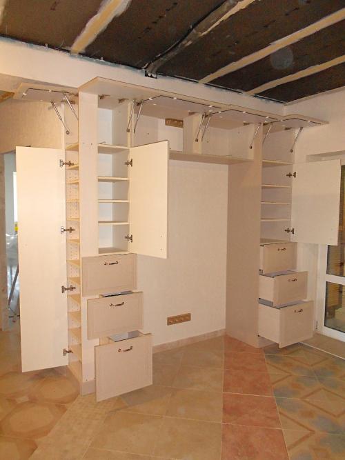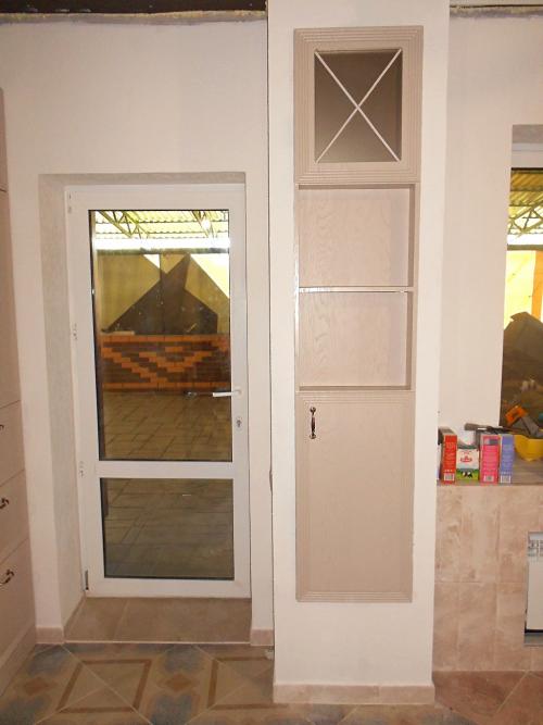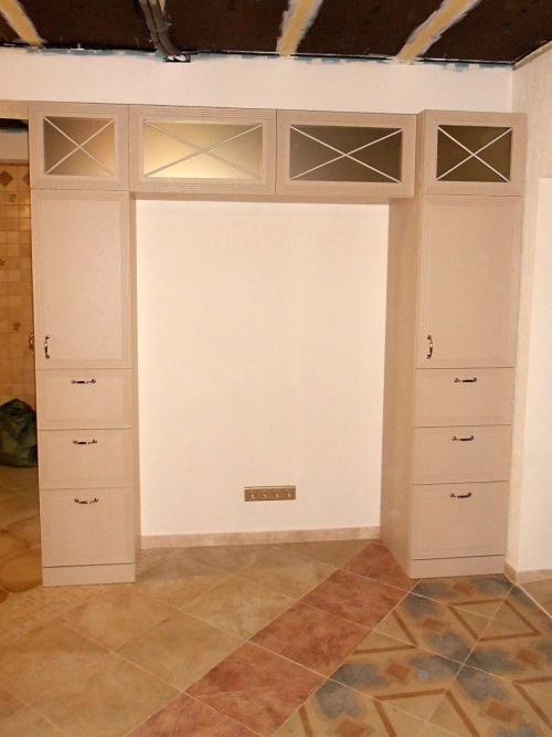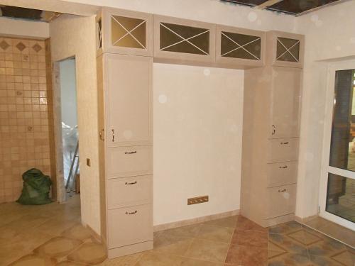 Мебель в гостиную в классическом стиле. Фасады в пленке пвх с фрезеровкой. Верхние фасады со вставками зеркало БРОНЗА САТИН и раскладкой из молдинга. Открываются вверх толкателями Пуш. Внешние элементы корпуса в пленке пвх.