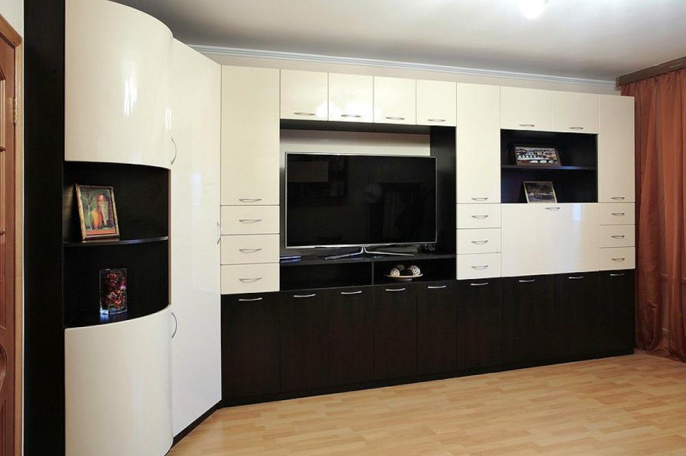 Вместительный угловой набор мебели с распашными фасадами. В него входит угловой шкаф, радиусная колонка с фасадами и прямой шкаф с большой нишей для ТВ и нишей с открытой полочкой. Много выдвижных ящиков.