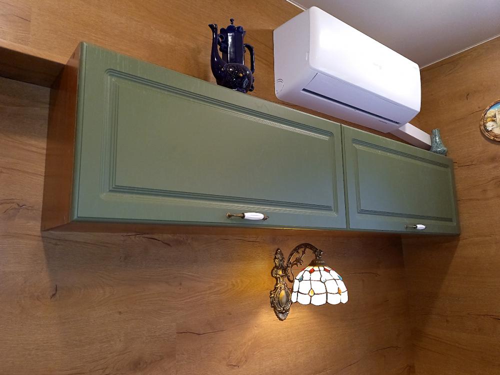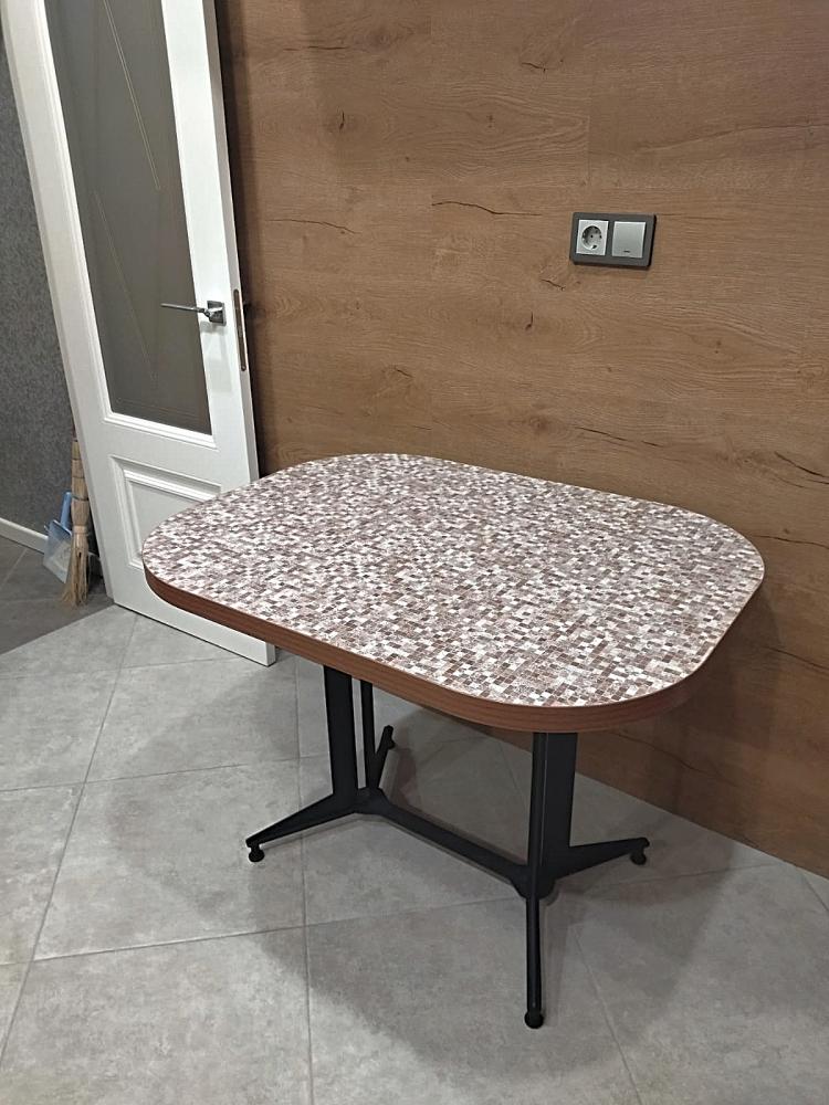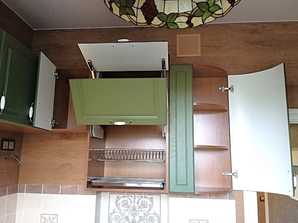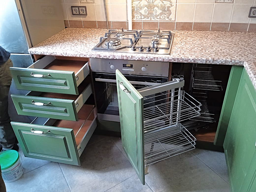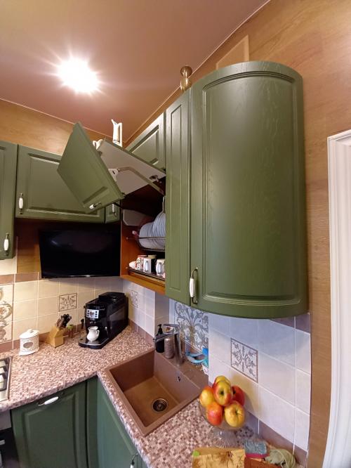 Угловая кухня в классическом стиле. Фасады в пленке пвх однотонной с древесной структурой, с фрезеровкой. Вепхние полки увеличенной высоты. В угловой тумбе разместили "Волшебный уголок". Фасады сушки скодные. Стык столешниц- еврозапил. Механизмы выдвижных ящиков с доводом. На противоположной стене два дополнительных подвесных шкафа с откидными вверх фасадами. Так же изготовили кухонный стол.
