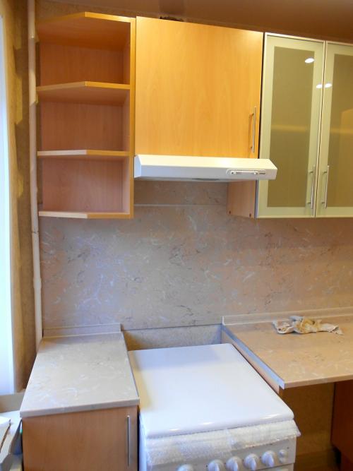 Угловая кухня в спокойных тонах. В нижней линии кухни отдельно стоящая плита и стиральная машина. В центре верхней линии кухни шкаф с фасадами стекло матовое в алюминиевой рамке.