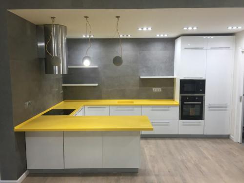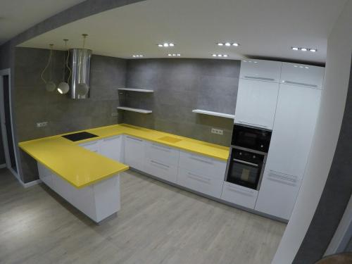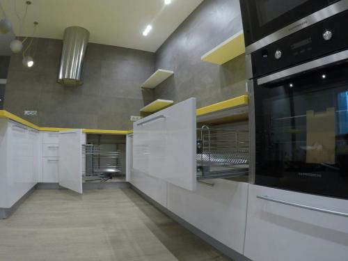 Оригинальная п- образная кухня без верхней линии шкафов. Сушка для посуды оборудована в выдвижных ящиках справа от мойки. Духовой шкаф и встроенная свч печь выведены в отдельную колонку. Холодильник встроенный. Низкая барная стойка, выполненная в виде островка с тумбами создает дополнительное место хранения.
