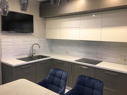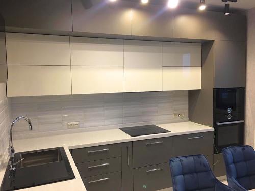 Угловая современная кухня с антресольными шкафами большой глубины. Столешница из искусственного камня. Встроенные духовой шкаф и свч печь в отдельном высоком модуле на удобной для хозяйки высоте. Много выдвижных ящиков разных габаритов в нижней линии. Открывание всех верхних фасадов- толкатели Пуш.