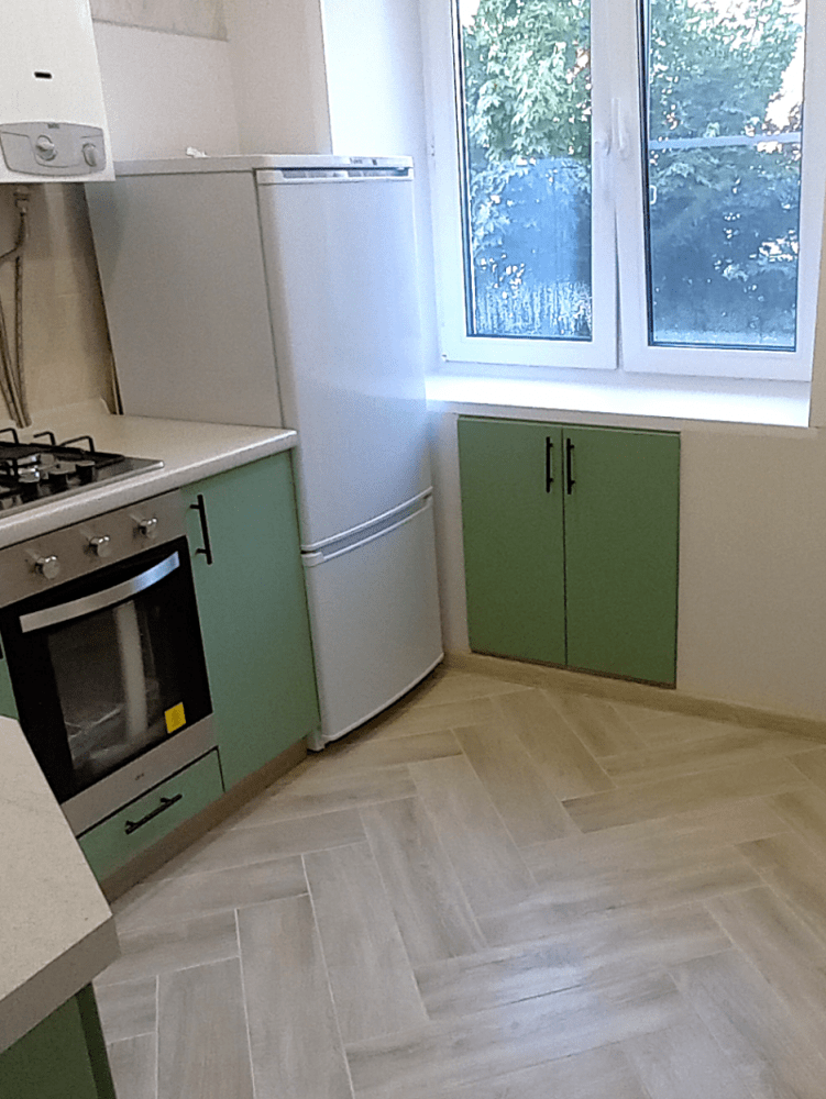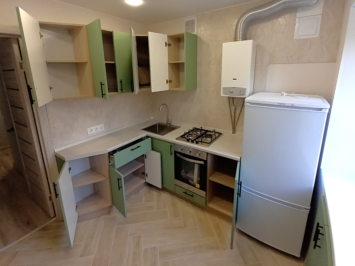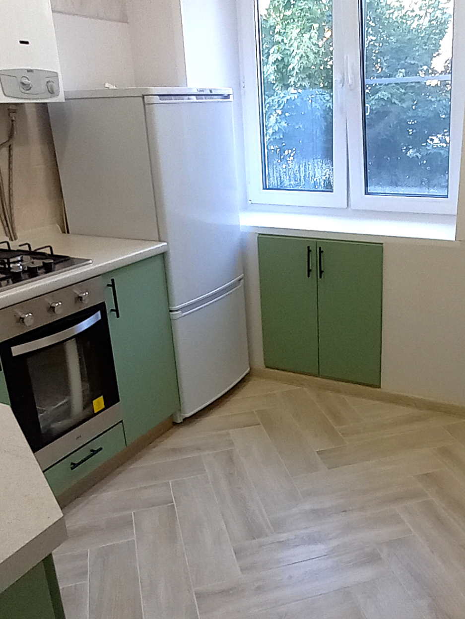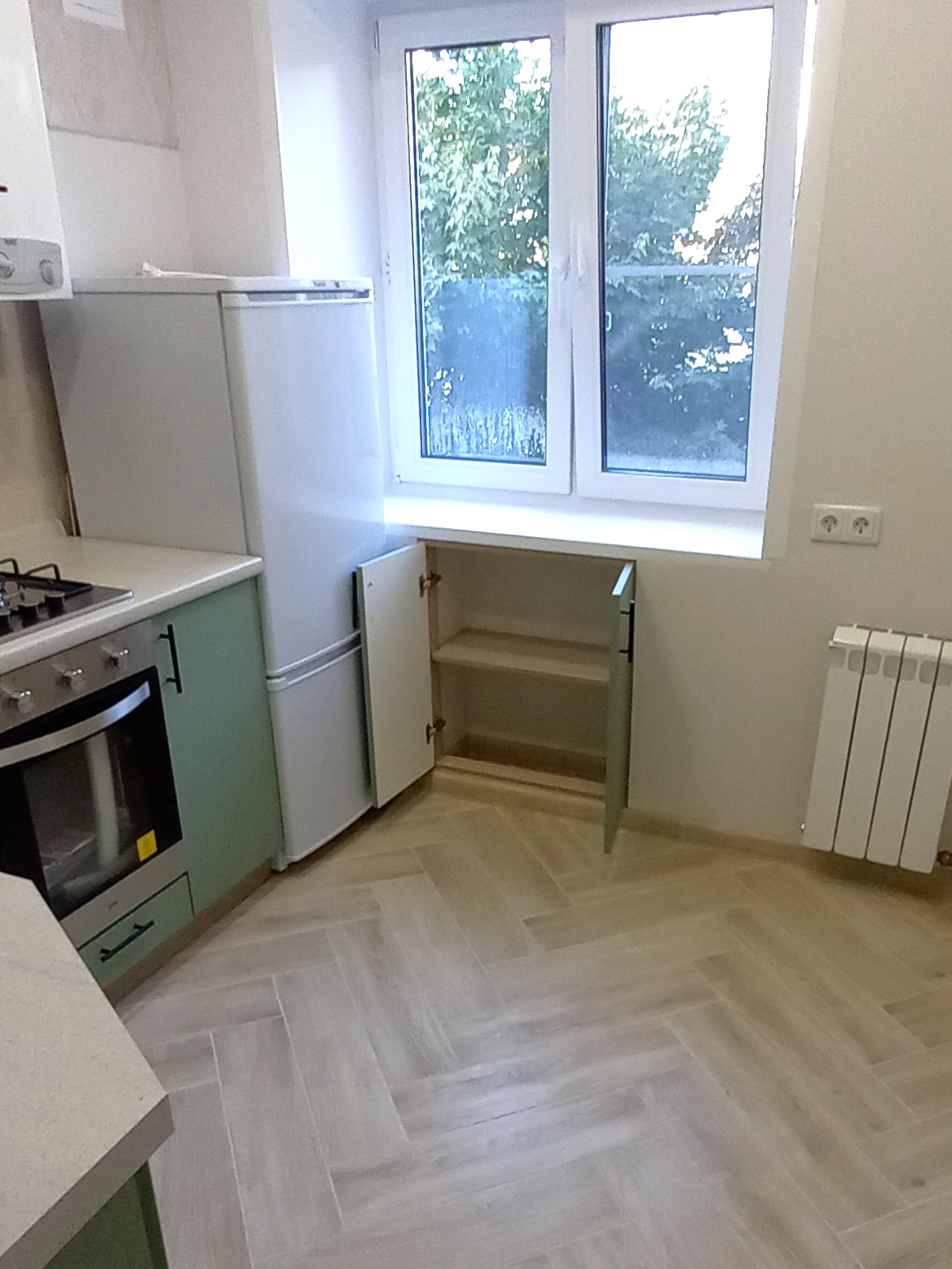 Компактная угловая кухня со встроенным шкафом в нишу под окно. Кухня лаконичная, без изысков, в квартиру ,которую планируют сдавать. Фасады в пленке пвх Софт Тач. Такая пленка легко моется. Столешница пластиковая.