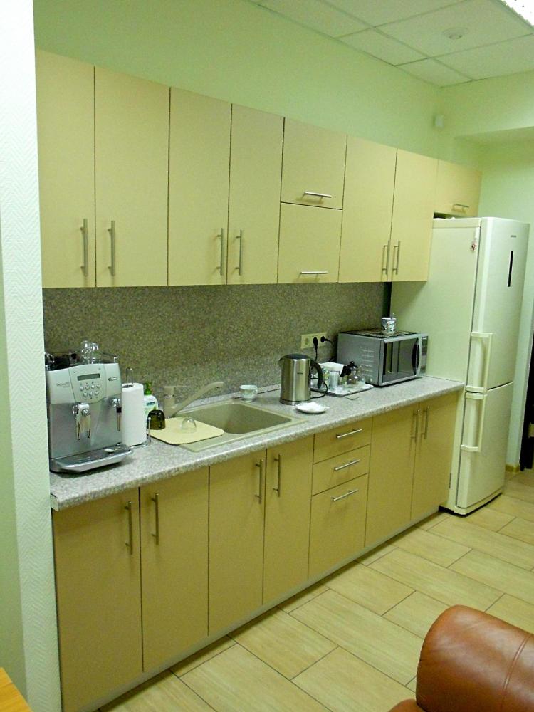 Удобная прямая кухня для сотрудников в офис. Без духового шкафа и варочной панели. Холодильник в линии кухни.