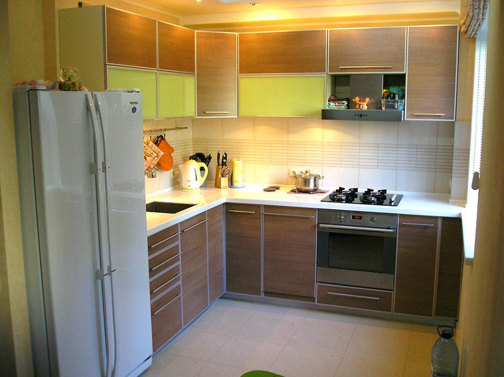 Угловая кухня с фасадами из пластика. Столешница из искусственного камня с мойкой подстольного монтажа, переходящая в подоконник.