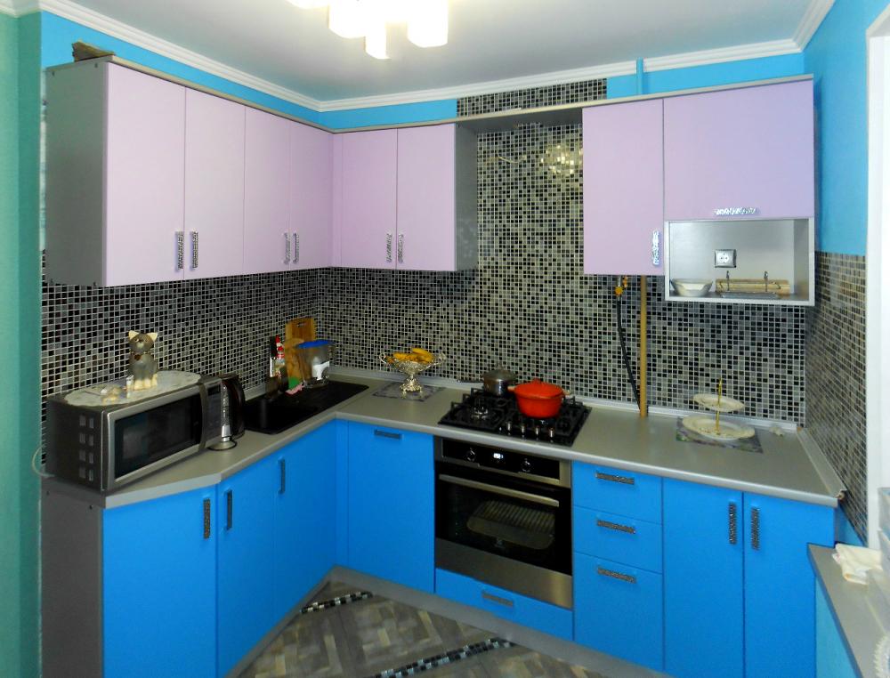 Яркая угловая кухня в не большую кухню "хрущевки" со встроенной техникой.