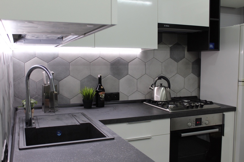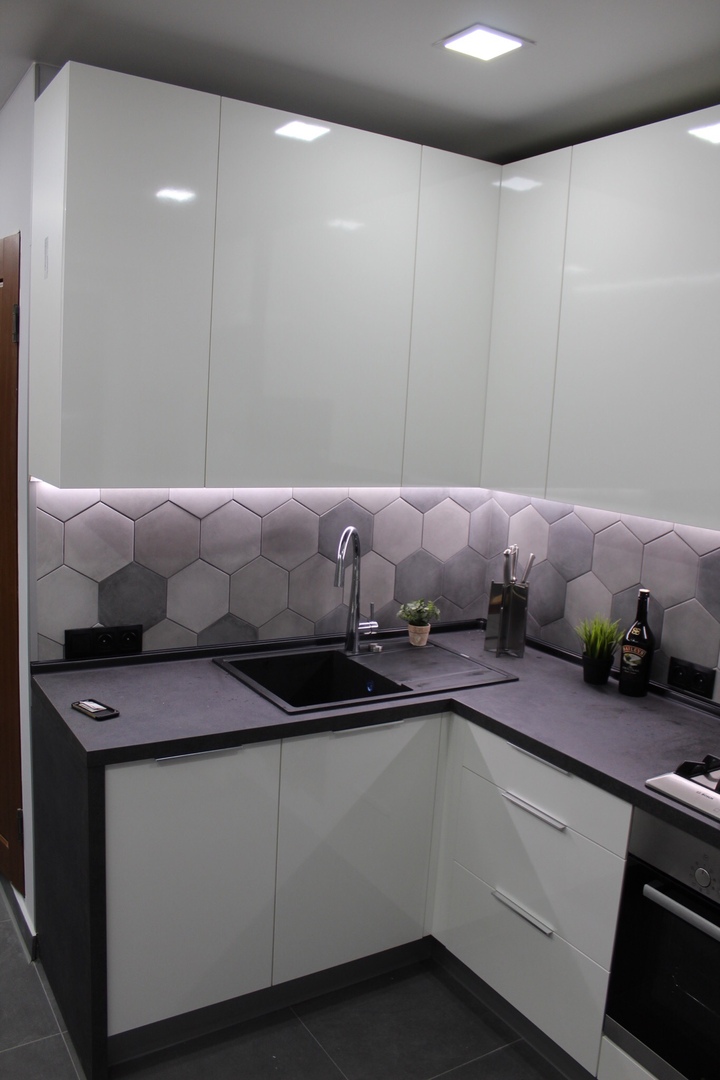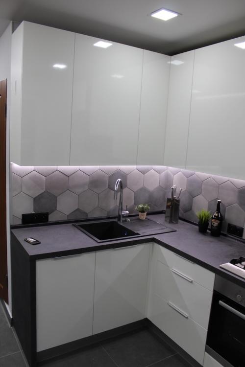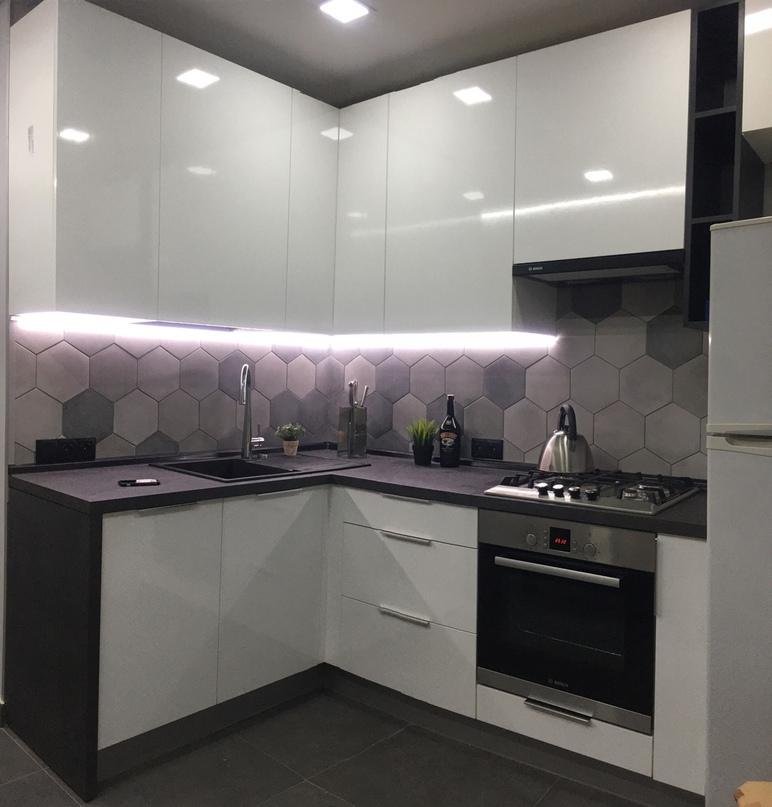 Удобная и компактная угловая кухня. Подсветка светодиодная, по всей длинне кухни. рабочей поверхности. Верхние фасады открываются нажатием. В верхнем угловом шкафу складные фасады. Вытяжка встроенная. Фасады покрыты эмалью и финишным слоем глянцевого лака. Эмаль- дорогое и качественное покрытие. Современные эмали не тускнеют, устойчивы к бытовой химии. За ними достаточно легко ухаживать. Выбор оттенков огромен.