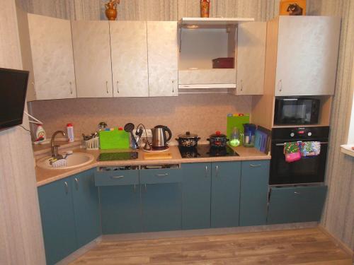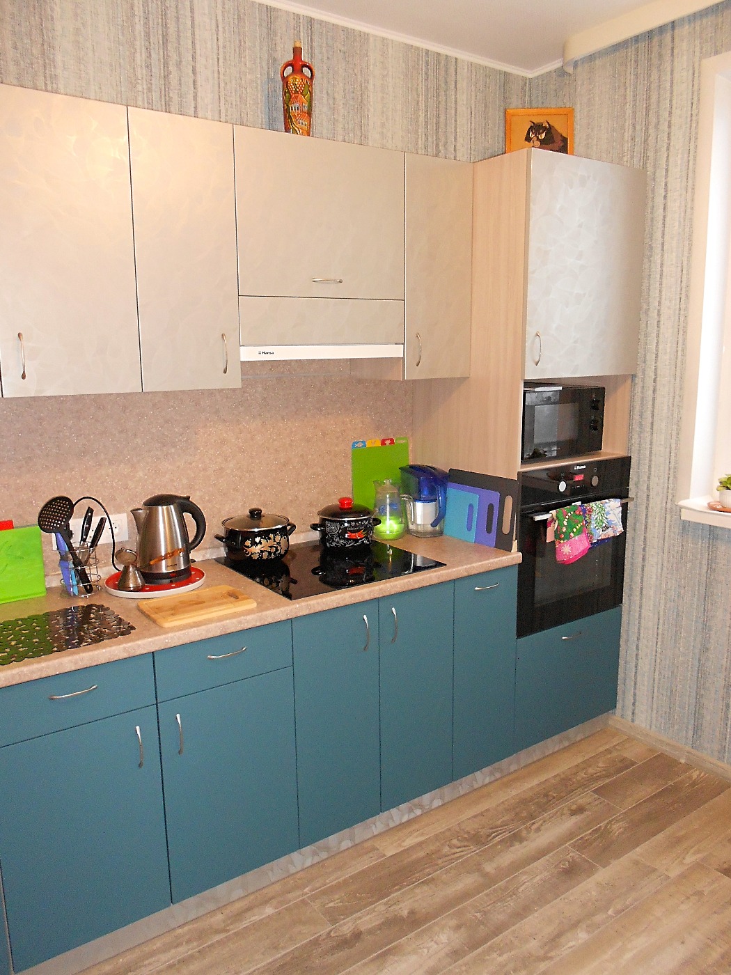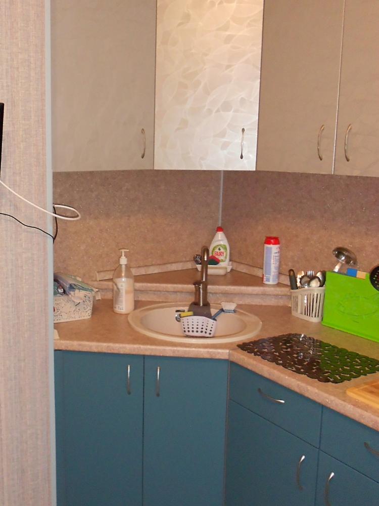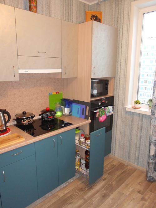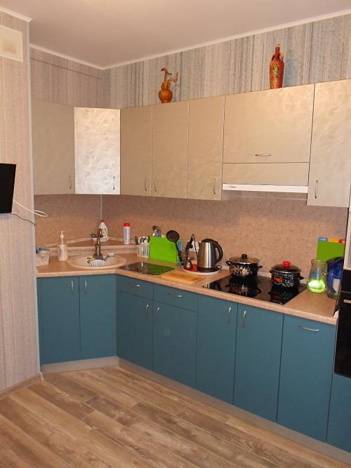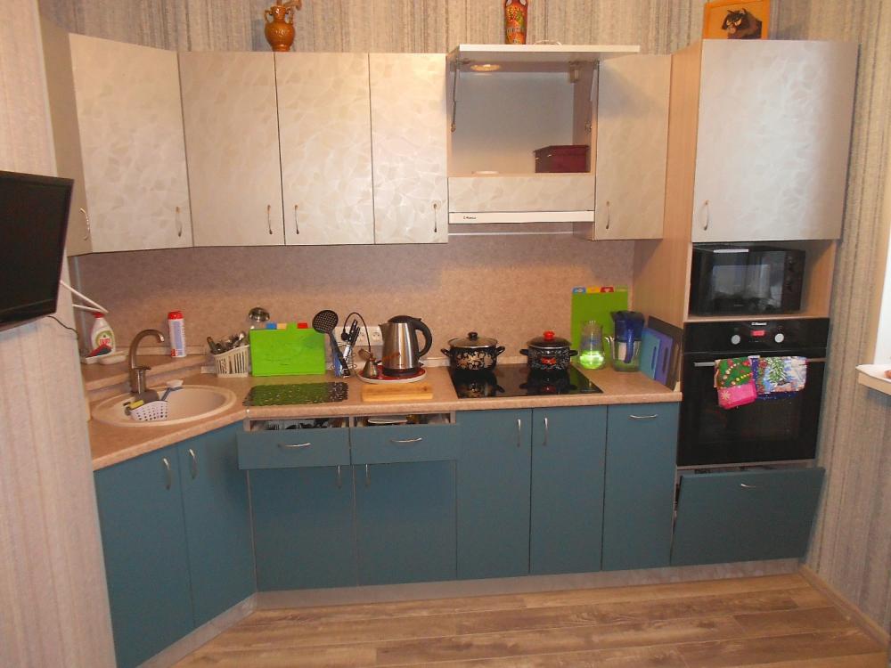 Просторная угловая кухня с пеналом для духового шкафа и свч печи.Верхние фасады- пленка пвх. Нижние фасады в пленке пвх Супер мат. Эта пленка легко моется от загрязнений. Вытяжка встроенная замкнутого цикла. Мойка из искусственного камня.