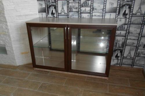 Комплект из двух невысоких шкафов- витрин для посуды с зеркальными задними стенками, стеклянными полками и фасадами рамка МДФ.