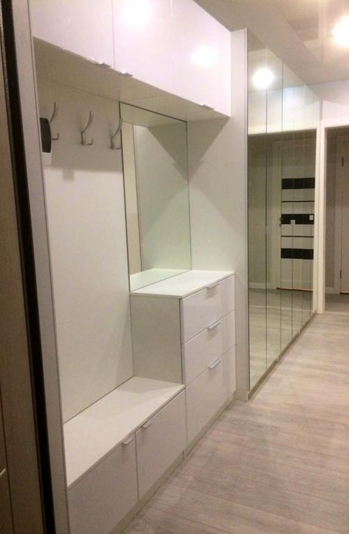 Огромный вместительный распашной шкаф с распашными зеркальными фасадами, открытая вешалка с крючками, антресолями и тумбами. Большой коридор позволяет разгрузить жилые комнаты от лишней мебели и сделать их более просторными.