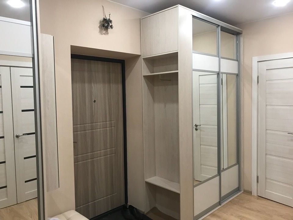 Два корпусных светлых шкафа- купе с открытой вешалкой под плечики и антресолью, и полкой за зеркальным распашным фасадом в прихожую. В обоих шкафах штанги для одежды на всю их ширину, антресольные полки.