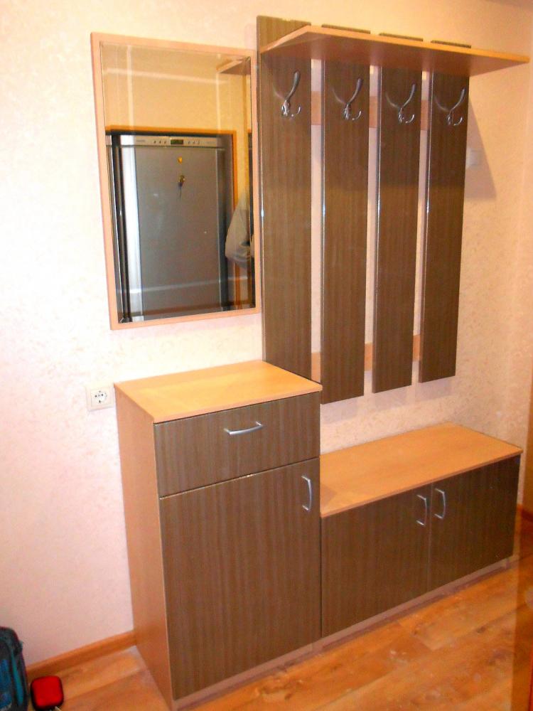 Компактная прихожая с реечным модулем с крючками для одежды и полкой для головных уборов, тумбой обувной, тумбой с ящиком и зеркалом на лдсп щите. Тумба обувная, тумба вертикальная, зеркало на щите лдсп и реечная открытая вешалка с крючками.