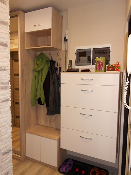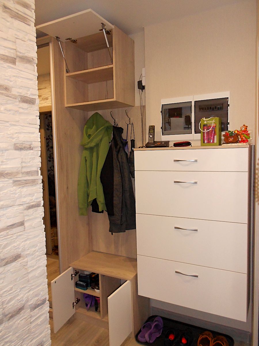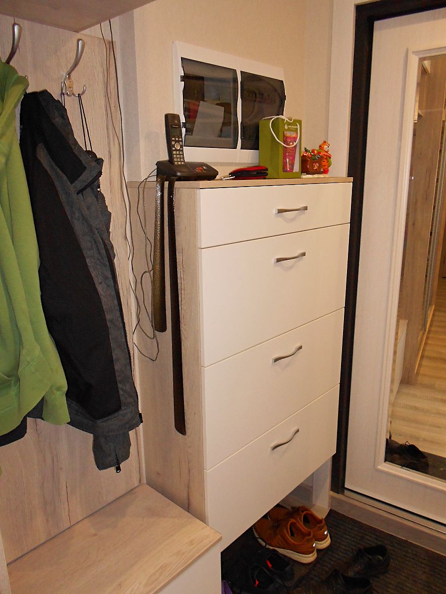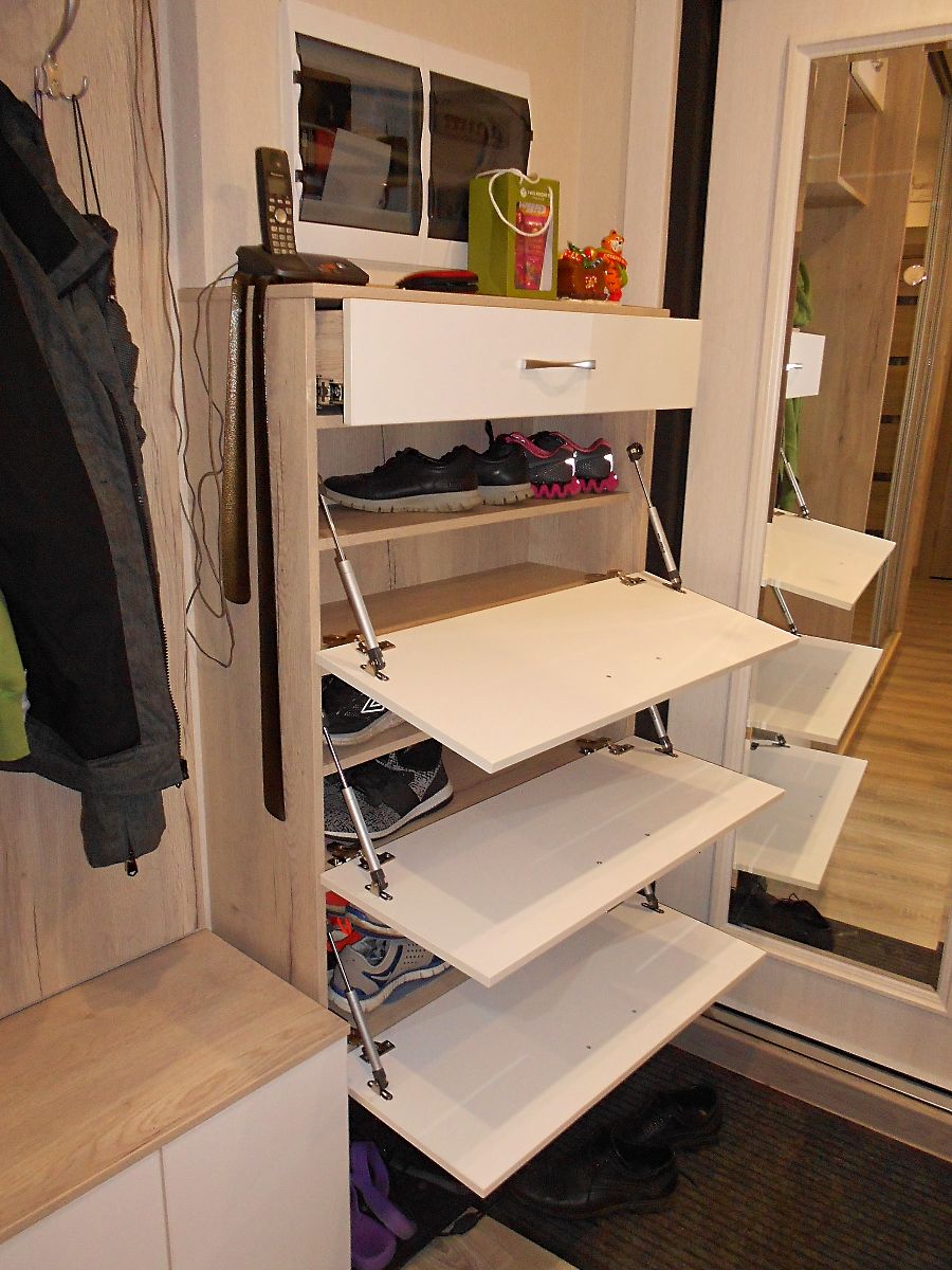 Корпуса и распашные фасады изготовлены из лдсп Эггер. Удобная подвесная тумба для обуви.
