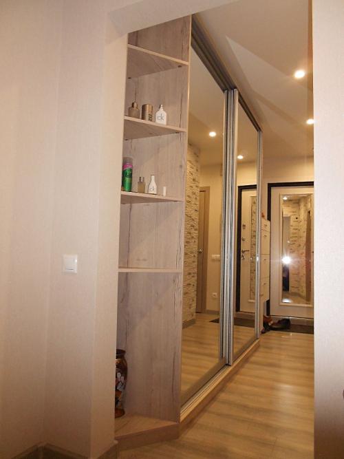 Удобная и вместительная мебель в длинную прихожую. Шкаф- купе с зеркалами в фасадах. Глубина шкафа уменьшенная, штанги для одежды выдвижные.