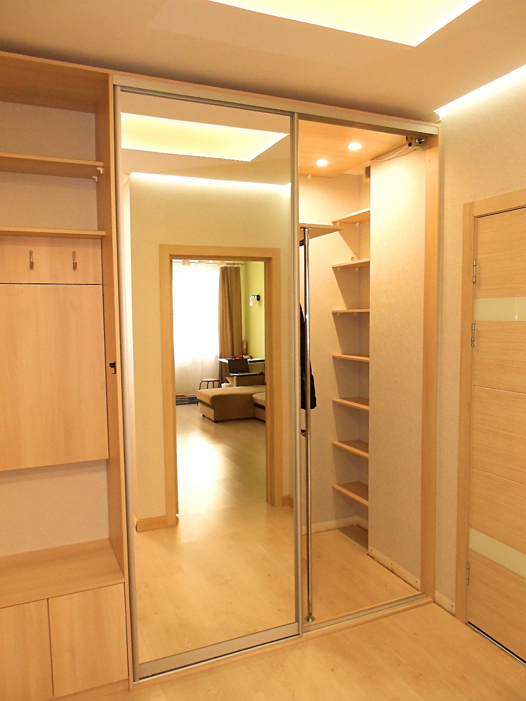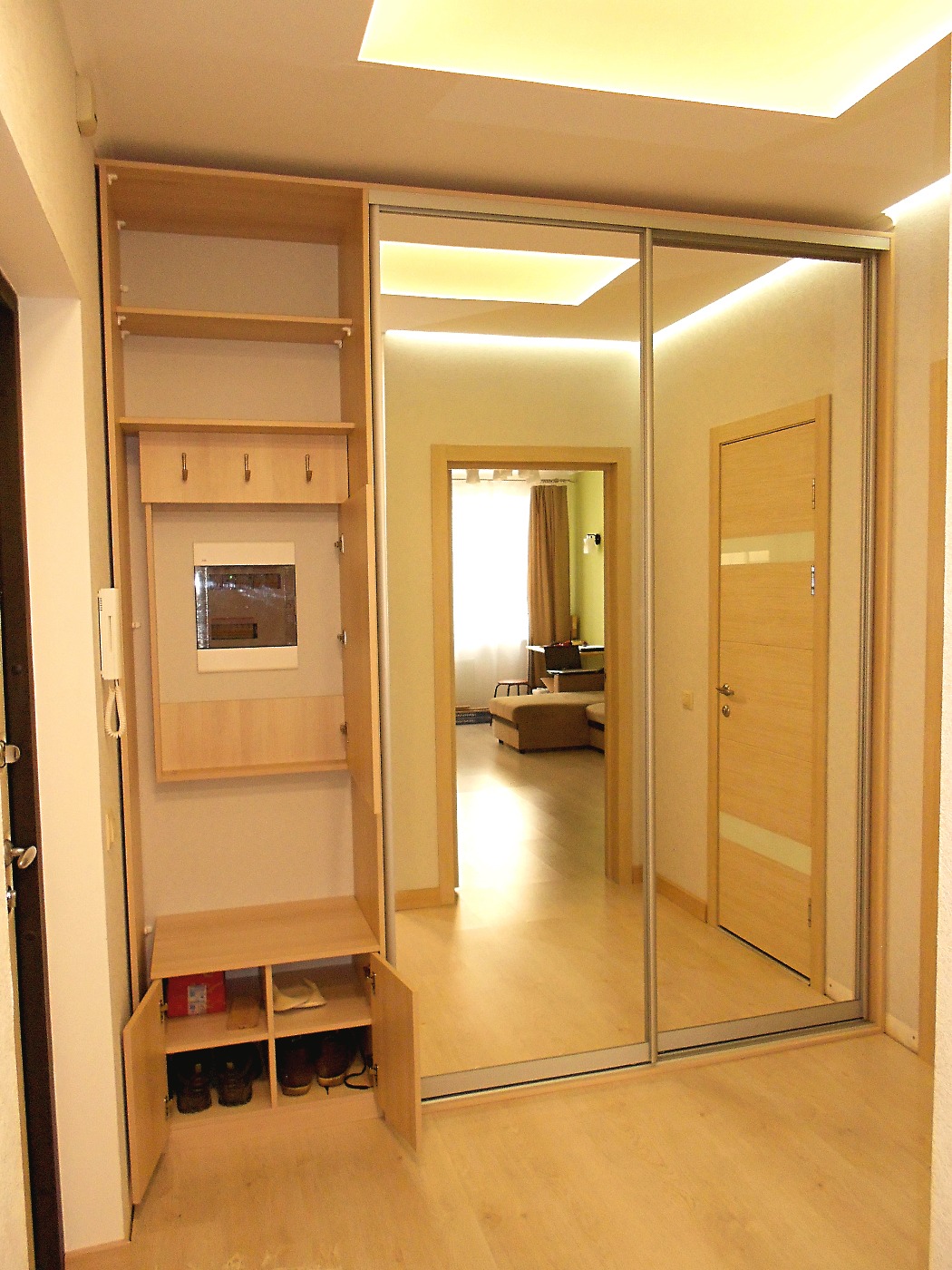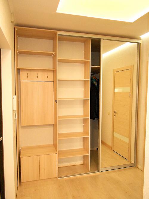 Удобный встроенный шкаф- купе в глубокую нишу с подвесной полкой, обувной тумбой и открытой вешалкой с крючками для одежды. По желанию клиента конструкция имеет крышу лдсп, в которую установлены два светильника для освещения внутри шкафа- купе. Подвесная полка закрывает электрический щиток. На неподвижную часть полки прикреплены рти крючка для быстрого раздевания.