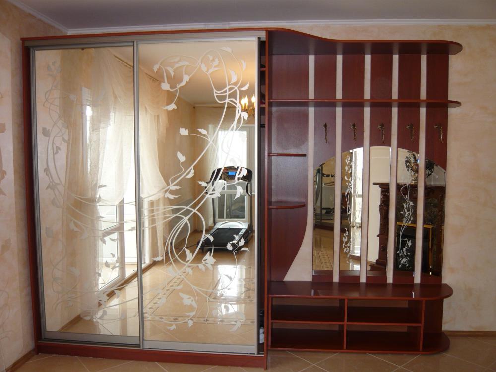 Большой шкаф- купе с зеркальными фасадами, открытой реечной вешалкой и обувной тумбой. Зеркала в фасадах- купе с пескоструйным рисунком. Над крючками реечной вешалки открытая полочка для головных уборов.