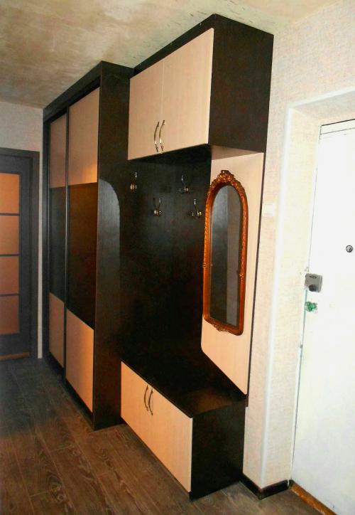 Встроенный шкаф- купе двух дверный с открытой вешалкой, обувной тумбой и подвесной полкой для прихожей. В фасадах- купе вставки лдсп. Над фасадами- купе установлен короб для крепления натяжного потолка. Такой же короб установлен над фасадами подвесной полки. Комбинация открытой и закрытой зон хранения одежды создает максимальное удобство пользования.