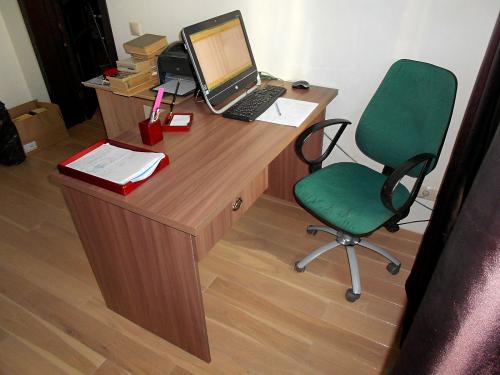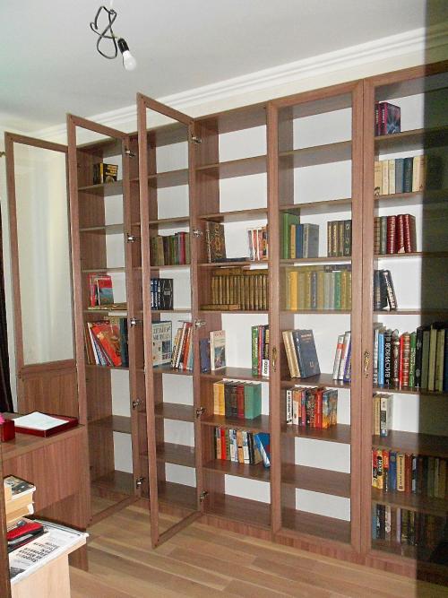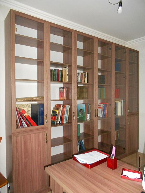 Фасады- рамка мдф со вставками из прозрачного стекла и лдсп. В комплект к библиотеке клиент заказал компактный рабочий стол