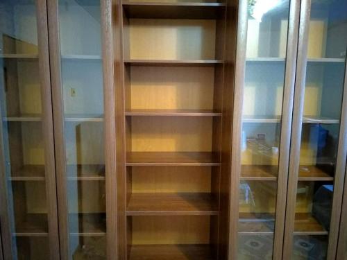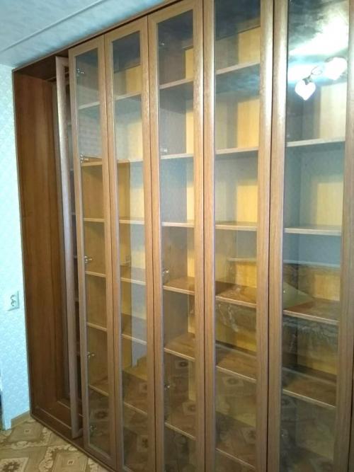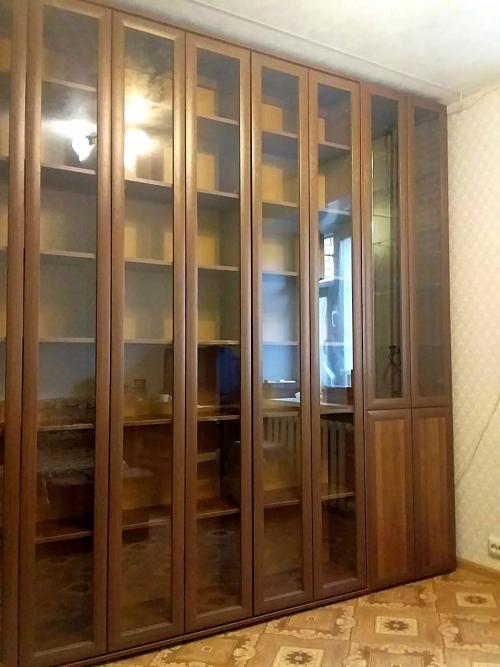 Вместительная и удобная двух рядная раздвижная библиотека с отдельным шкафом для посуды. Передние модули легко перекатываются, открывая задние полки. Удобное размещение и быстрый доступ к необходимой книге. Справа отдельный шкаф для посуды. Нижние фасады глухие. В зоне верхних задняя стенка с зеркалом.