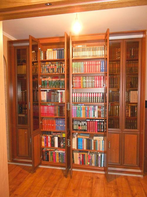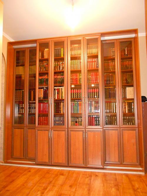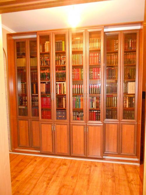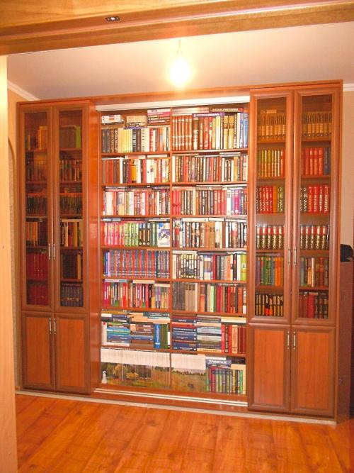 Вместительная двухрядная раздвижная библиотека для настоящих любителей книг. В заднем ряду четыре стационарных секции. Боковые секции с фасадами без ручек. Система открывания задних фасадов- Пуш. В переднем ряду два перекатных модуля с распашными фасадами. Фасады- рамка МДФ.