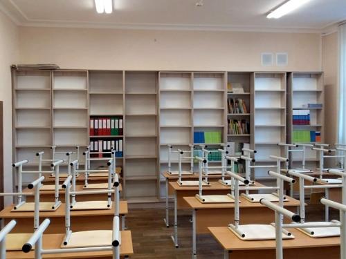 Большая раздвижная библиотека с открытыми стеллажами в школьный класс. Отсутствие фасадов упрощает поиск необходимого учебника и доступ к нему. Крыша библиотеки создает дополнительную антресоль, на которую можно ставить не тяжелые не часто используемые предметы.