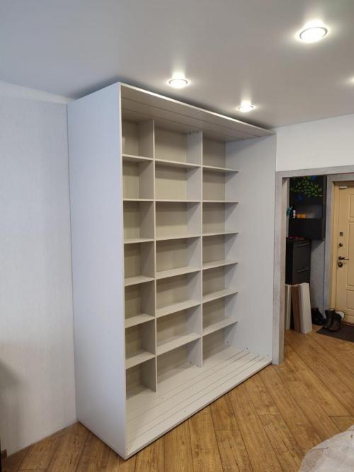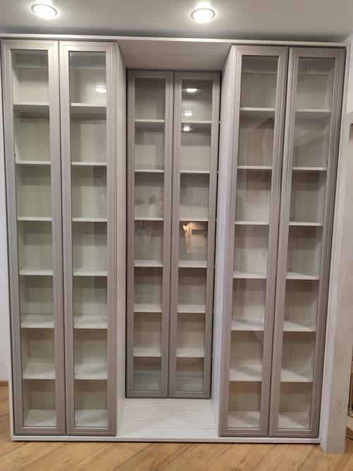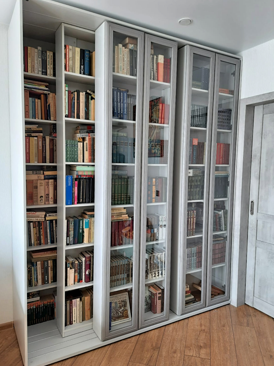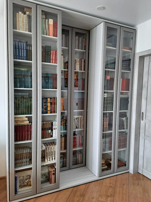 Трехрядная раздвижная библиотека в гостиную с паспашными фасадами. Фасады в рамке мдф с прозрачным стеклом. Открывание- нажатием. Глубина секций расчитана на книги разных форматов. Передние секции перекатываются легко и тихо.