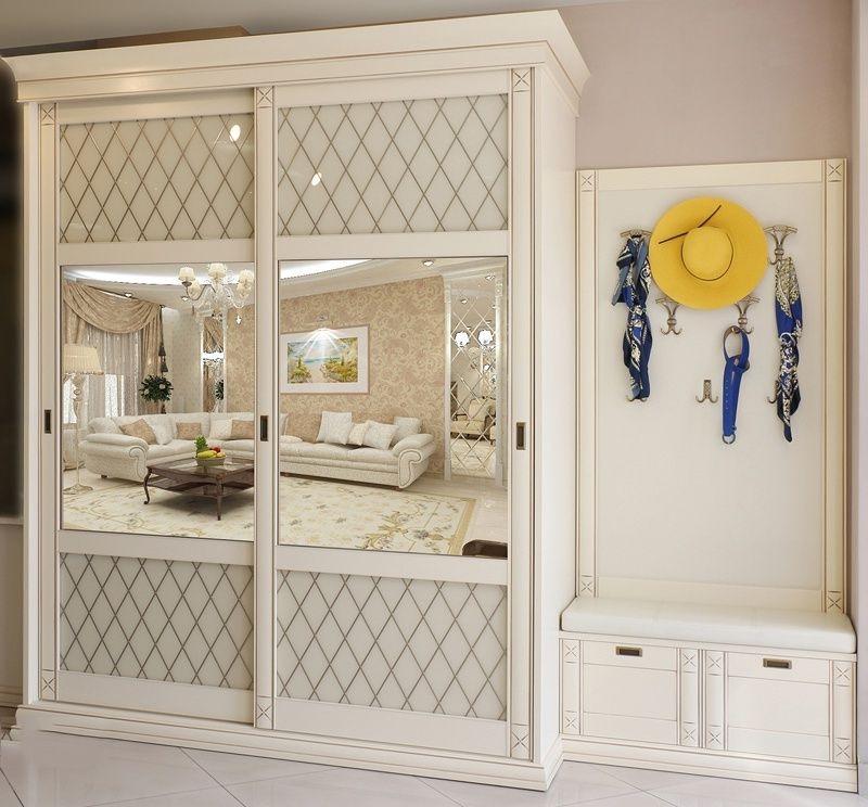 Шикарный вариант в классическом стиле шкафа- купе с открытой вешалкой и тумбой в прихожую. Рамки фасадов- купе, фасадов тумбы распашных, цоколь, пилястры и карниз могут быть выполнены в пленке ПВХ и эмали. Мягкое сиденье в искусственной коже.