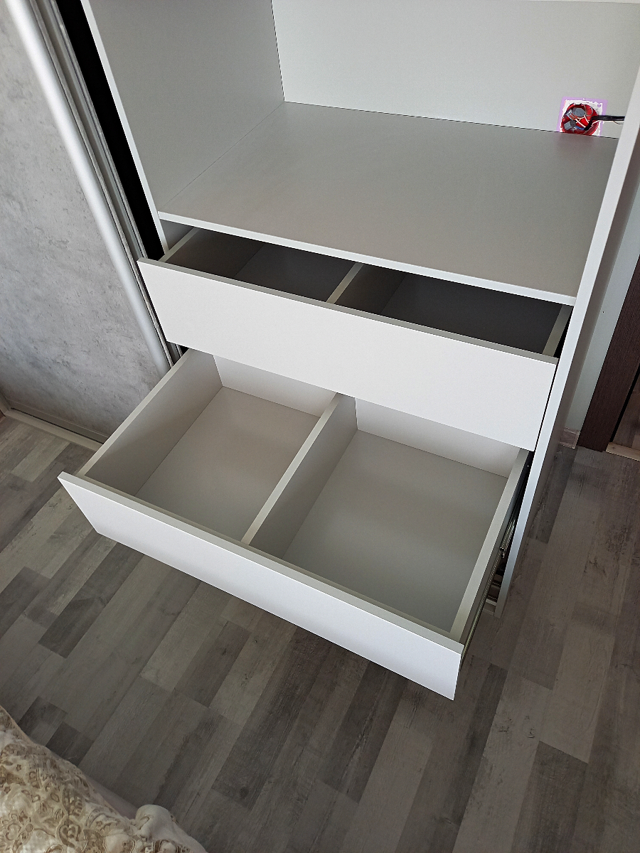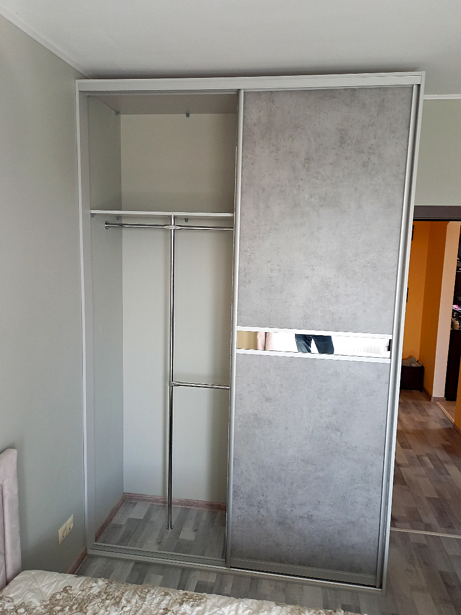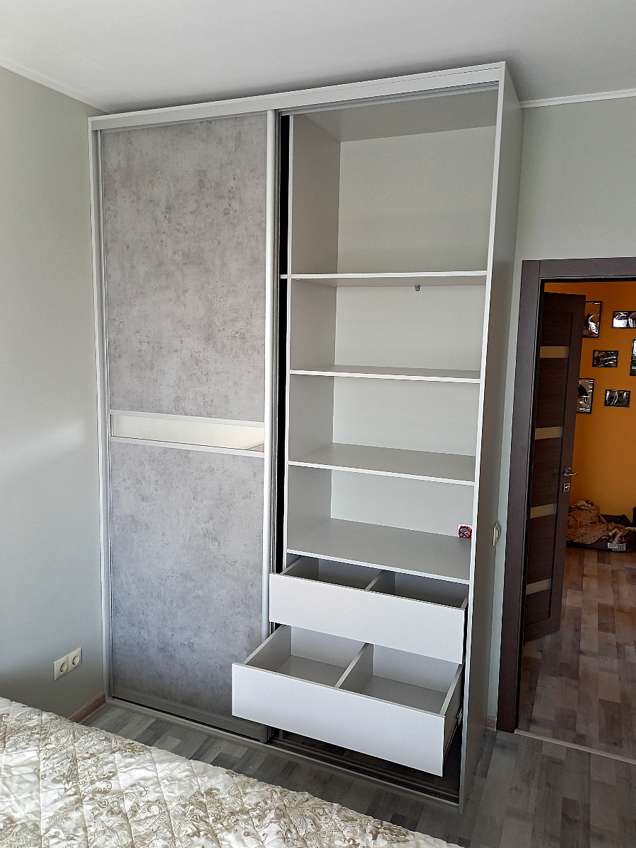 Полувстроенный шкаф- купе в спальню с современном стиле. Локаничный цвет корпуса. В фасадах вставки из мдф в пленке с рисунком бетона. По центру фасадов узкие вставки с матовым зеркалом. Шкаф рассчитан на хранение одежды и белья. Выдвижные ящики разделены по центру перемычкой. Один ящик- два отделения.