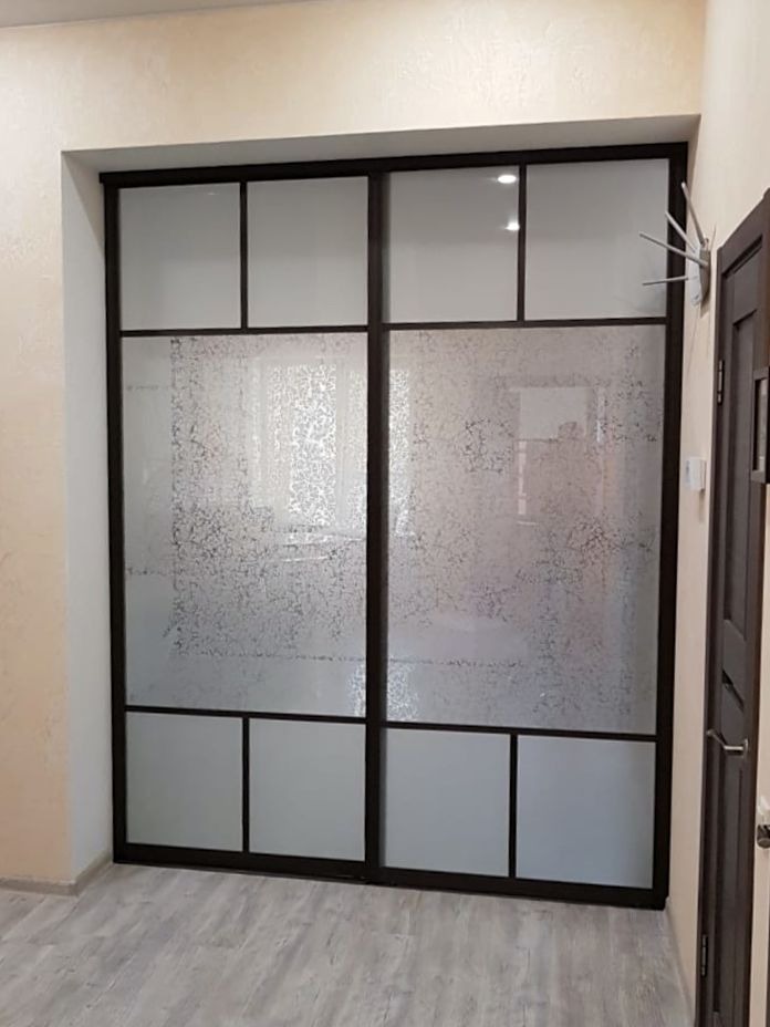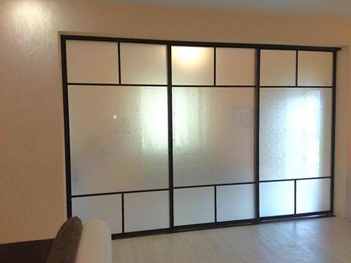 Широкие фасады- купе в нишу, разделяющие комнату на зоны. Особенностью данного проекта является то, что все три фасада можно сдвинуть к одной стене и освободить две трети ширины проема ,так как каждый фасад имеет собственный комплект направляющих. Ширина каждого фасада составляет 1.300 мм. В фасадах использован широкий профиль, что делает конструкцию прочнее, а внешний вид интереснее.