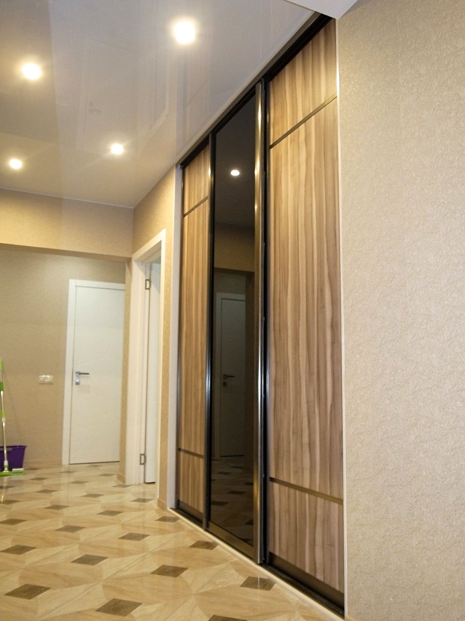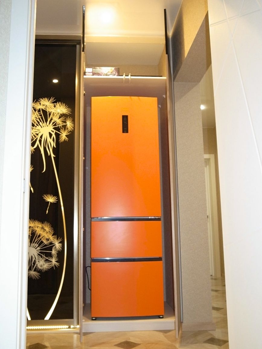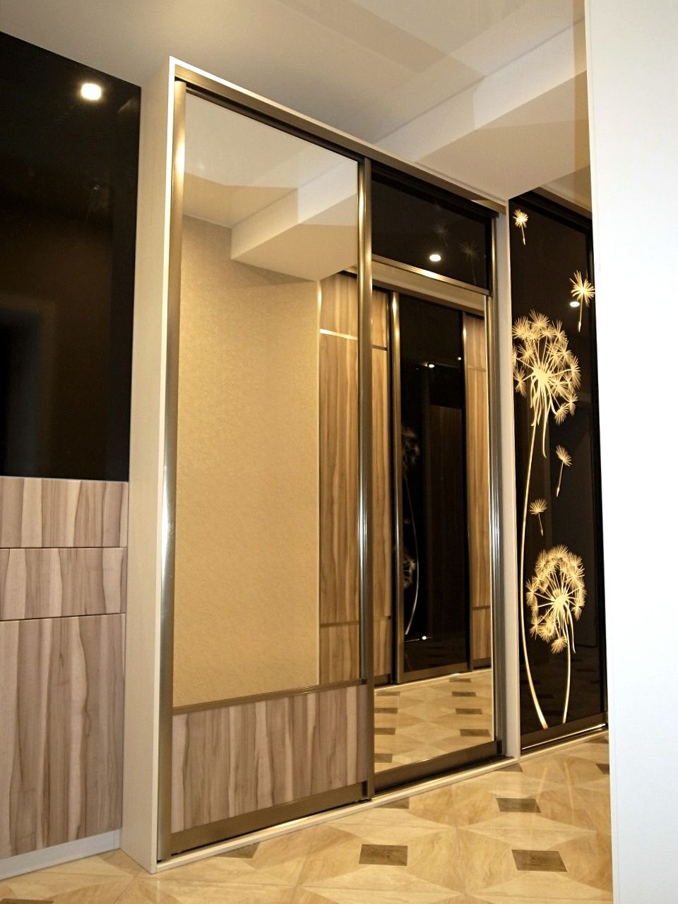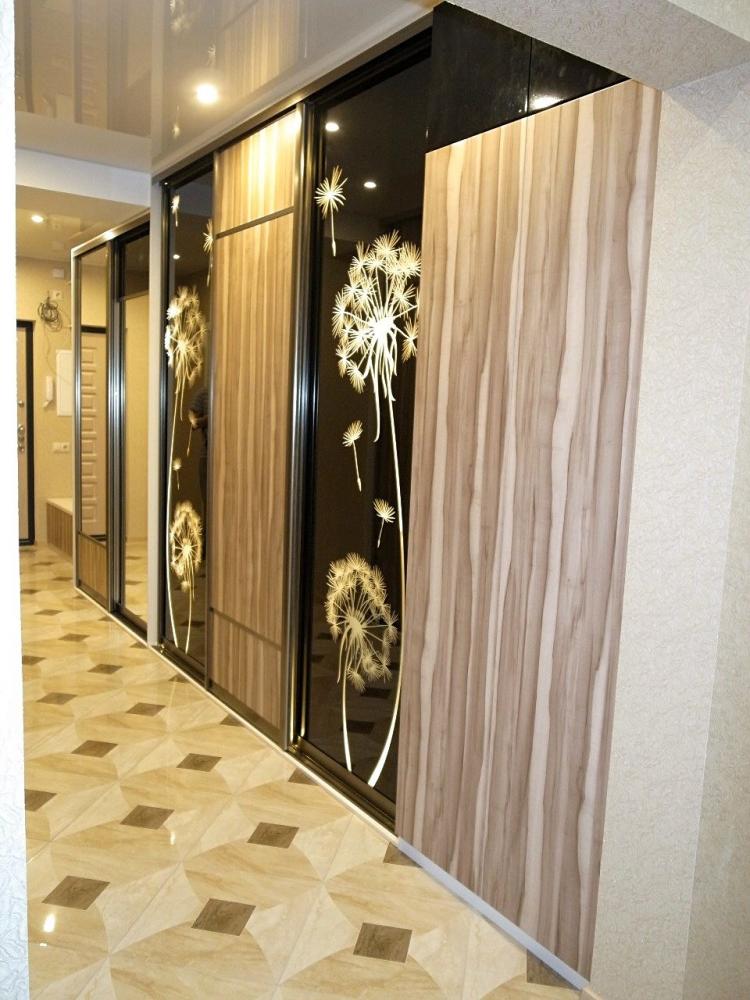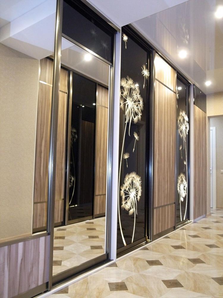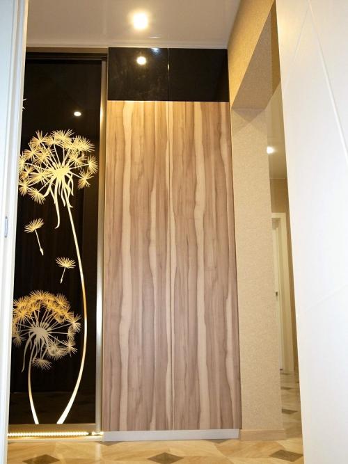 Шикарный набор шкафов в большую прихожую в современном стиле. Встроенные, полувстроенные и отдельно стоящие шкафы создают большую и комфортную зону хранения. В такой прихожей нашлось место для шкафов для одежды, холодильника, сейфа и для хозяйственного шкафа. Центральное место занимает встроенный шкаф- купе с подсвеченным пескоструйным рисунком в фасадах. Эта же подсветка является внутренним освещением в шкафу. Для удобства есть большая открытая вешалка. Все распашные фасады и фасады выдвижных ящиков открываются нажатием.