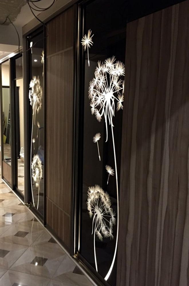 Фасады- купе: Алюминиевый профиль БРАШ с делителями,стекло крашенное с пескоструйным рисунком, пленка ПВХ матовая. Фасады распашные и выдвижных ящиков: пластик ЛЮКС, пленка ПВХ матовая.